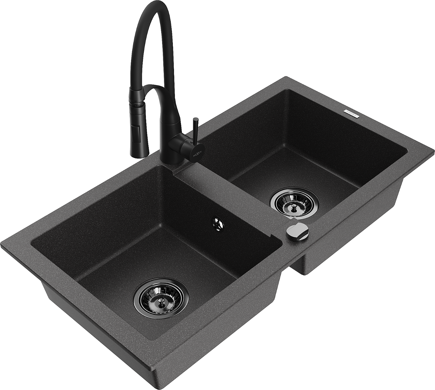 Mexen Mario divu nodalījumu granīta izlietne ar virtuves jaucējkrānu Aster, melna ar plankumiem - 6504-76-73450-70-B