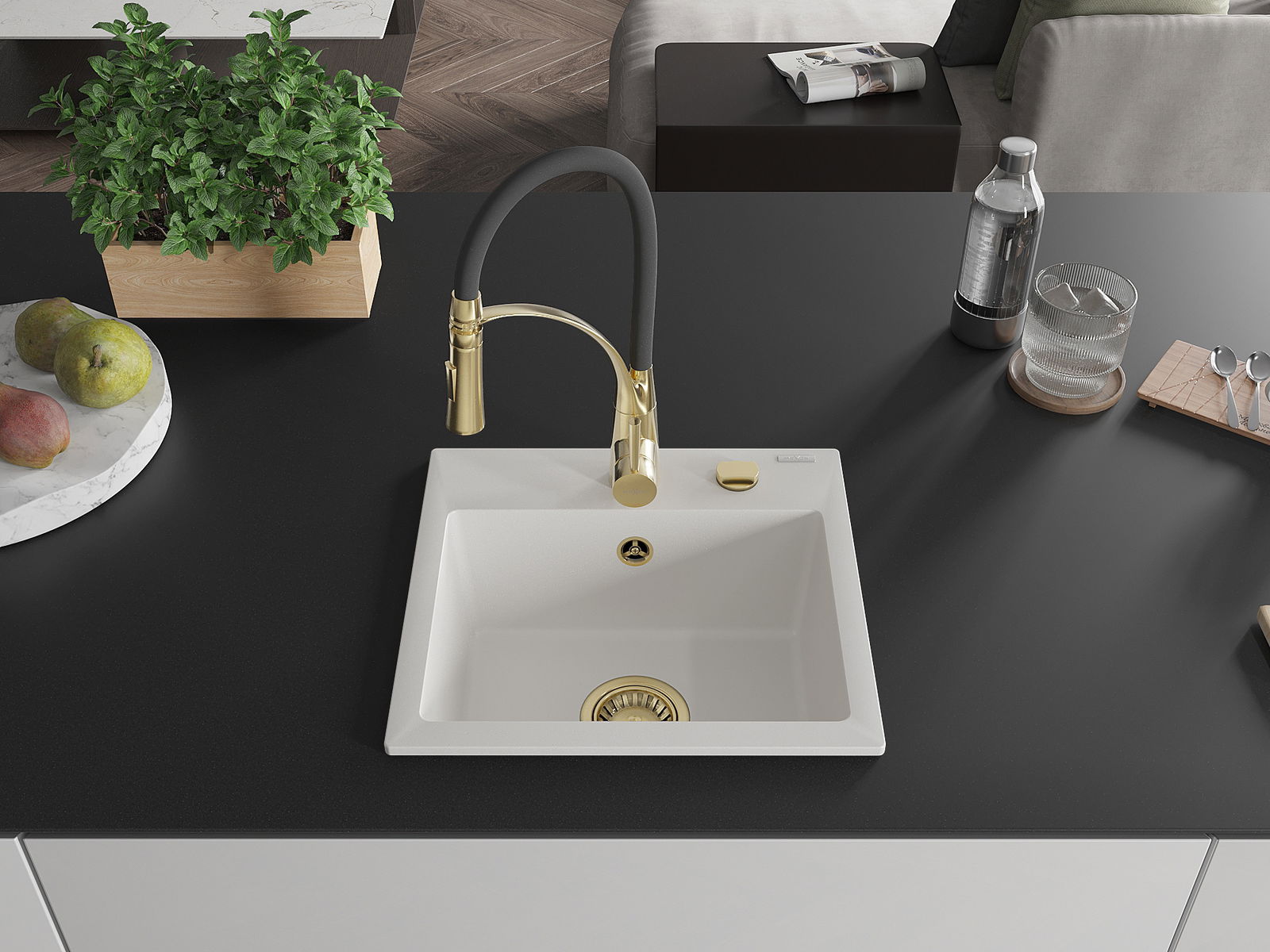 Mexen Milo granit izlietne ar 1 nodalījumu un virtuves jaucējkrānu Aster, balta - 6505-20-73450-57-G