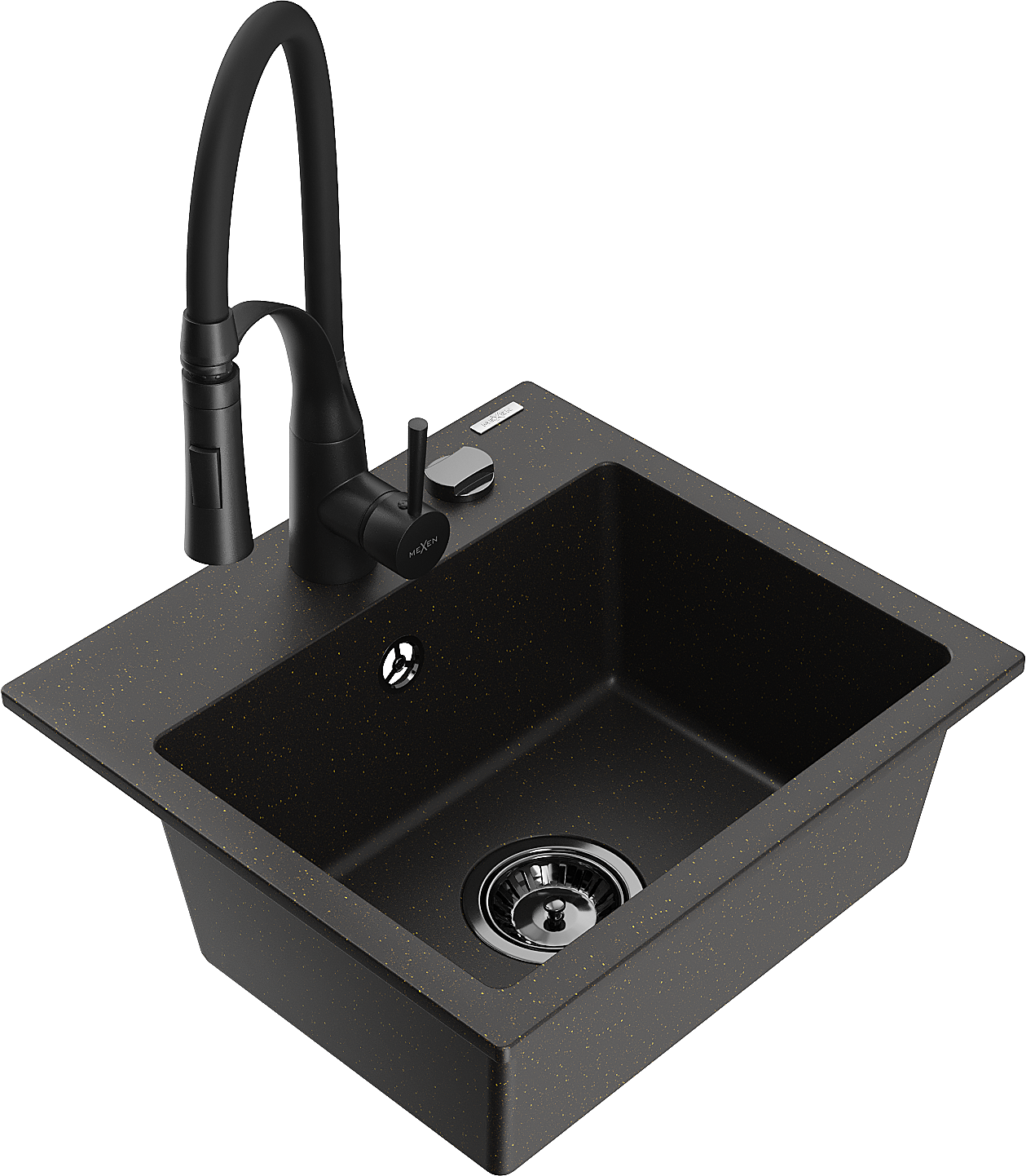 Mexen Milo Grants izlietne ar vienu nodalījumu un virtuves jaucējkrānu Aster, melns/zeltains metālisks - 6505-75-73450-70-B