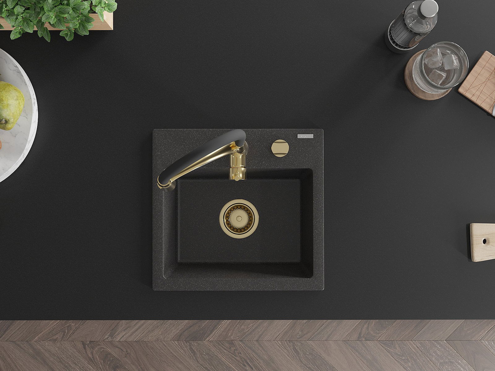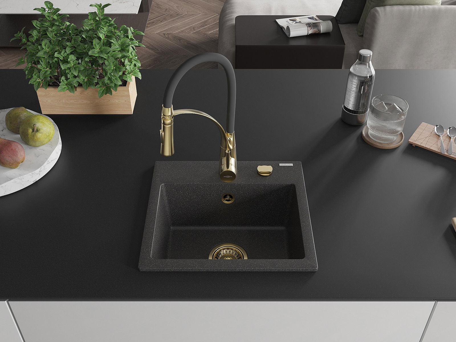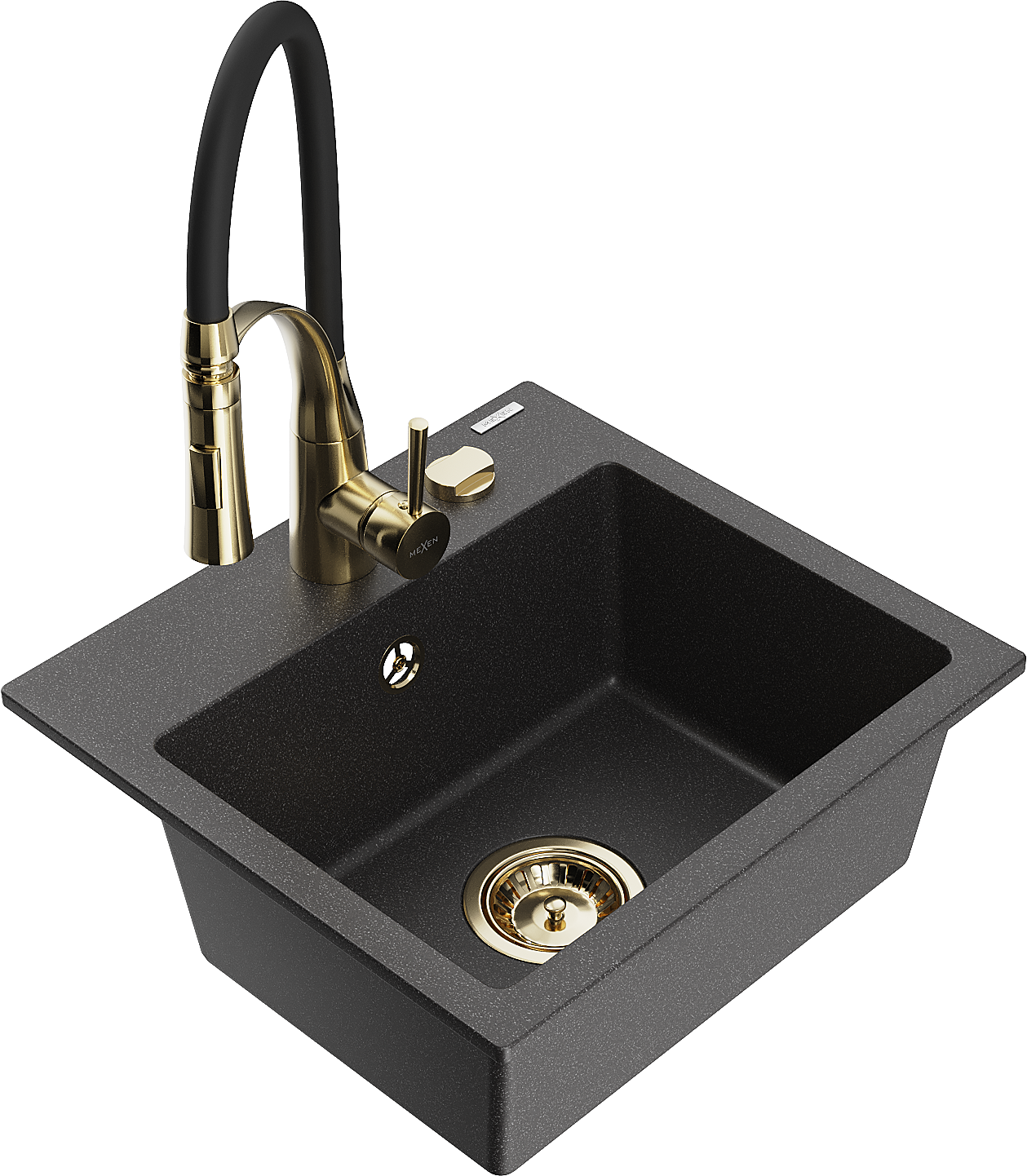 Mexen Milo granīta izlietne ar vienu nodalījumu un virtuves jaucējkrānu Aster, melna ar raibumiem - 6505-76-73450-57-G
