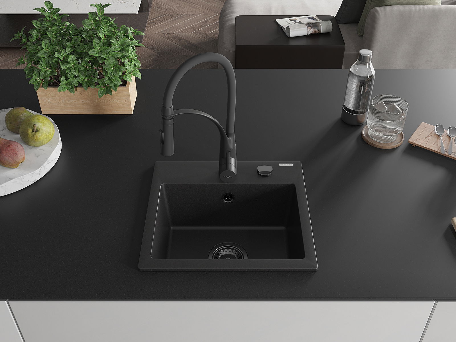 Mexen Milo granitizlietne 1-kameras ar virtuves jaucējkrānu Aster, melns - 6505-77-73450-70-B