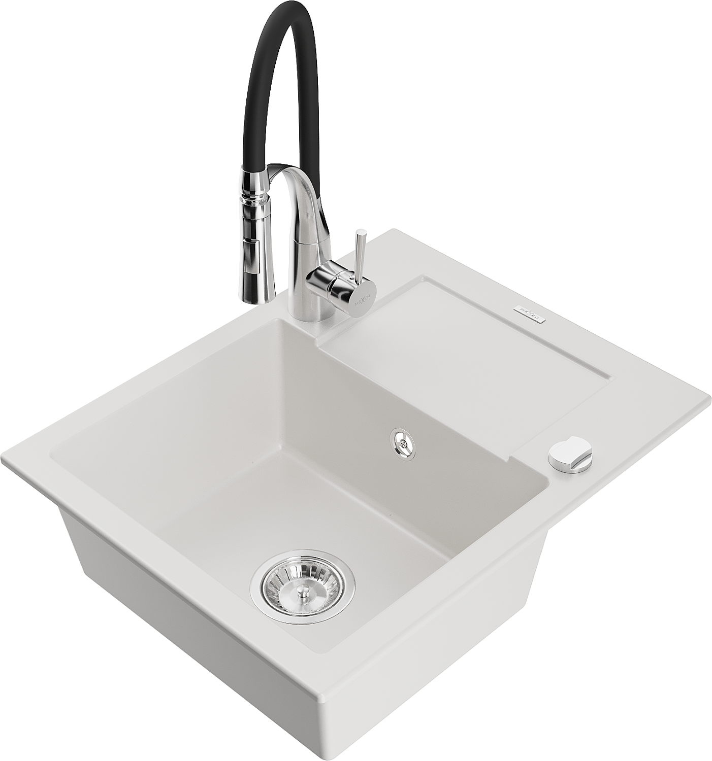 Mexen Enzo granitais izlietne ar vienu nodalījumu ar notekreni un virtuves jaucējkrānu Aster, balts - 6506-20-73450-07