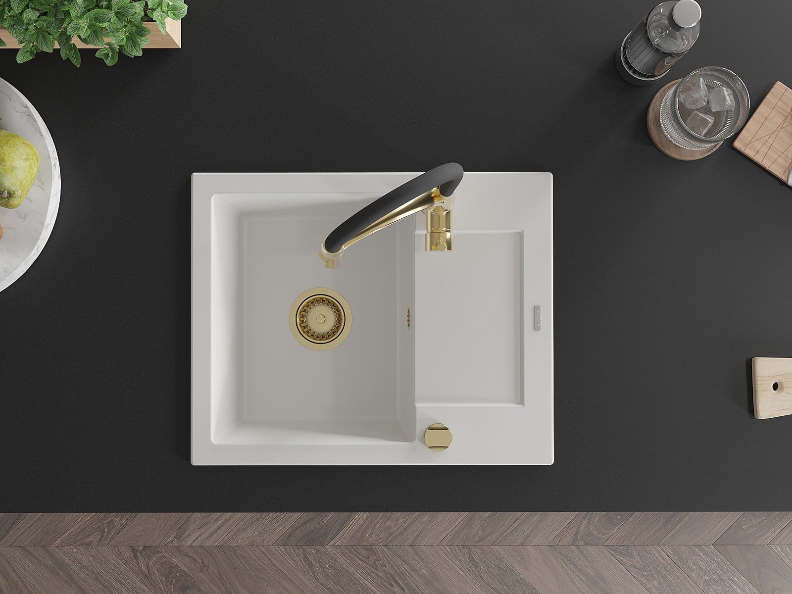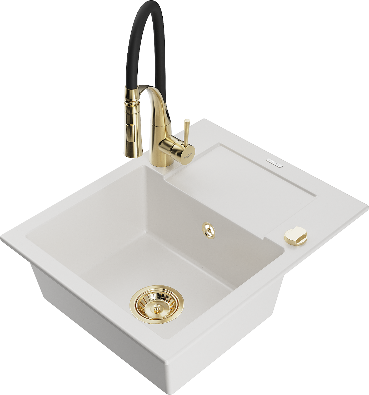 Mexen Enzo granitē izlietne ar vienu nodalījumu ar drenāžu un virtuves jaucējkrānu Aster, balta - 6506-20-73450-57-G
