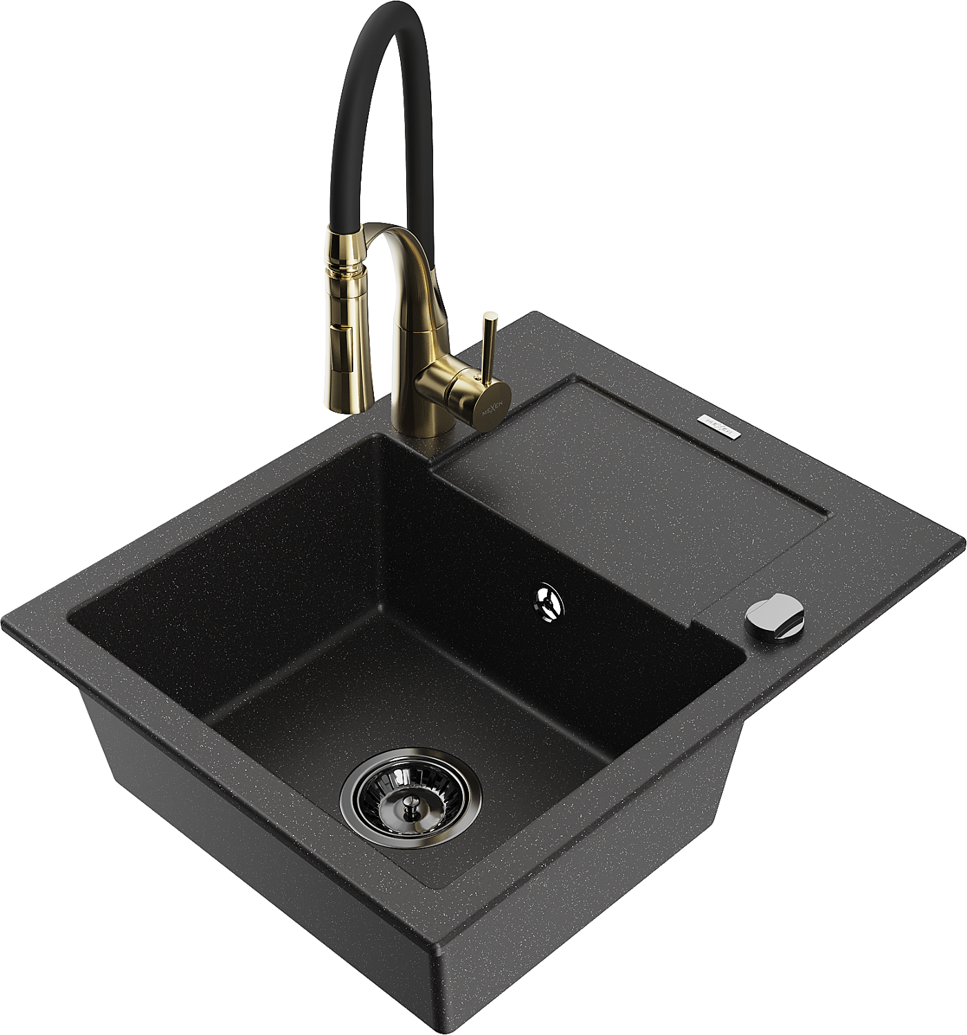 Mexen Enzo granitē ieskalošanas izlietne ar vienu nodalījumu un noteci, virtuvē ar jaucējkrānu Aster, melns/sudraba