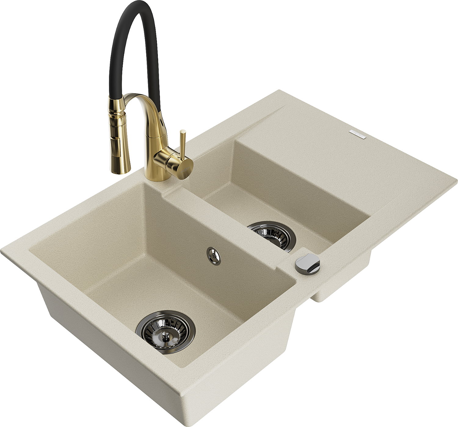 Mexen Gaspar 1,5 nodalīts granīta izlietne ar notecējumu un virtuves jaucējkrānu Aster, bēša - 6507-69-73450-57-B
