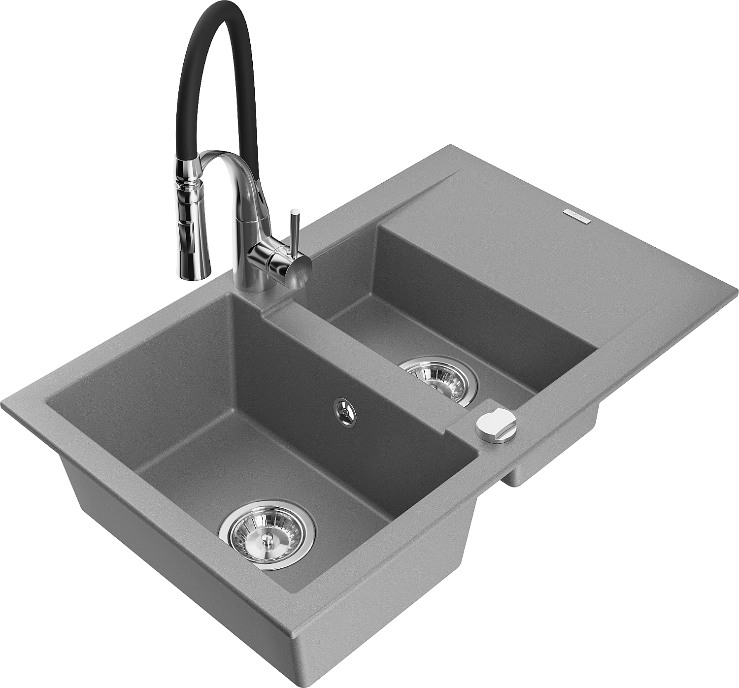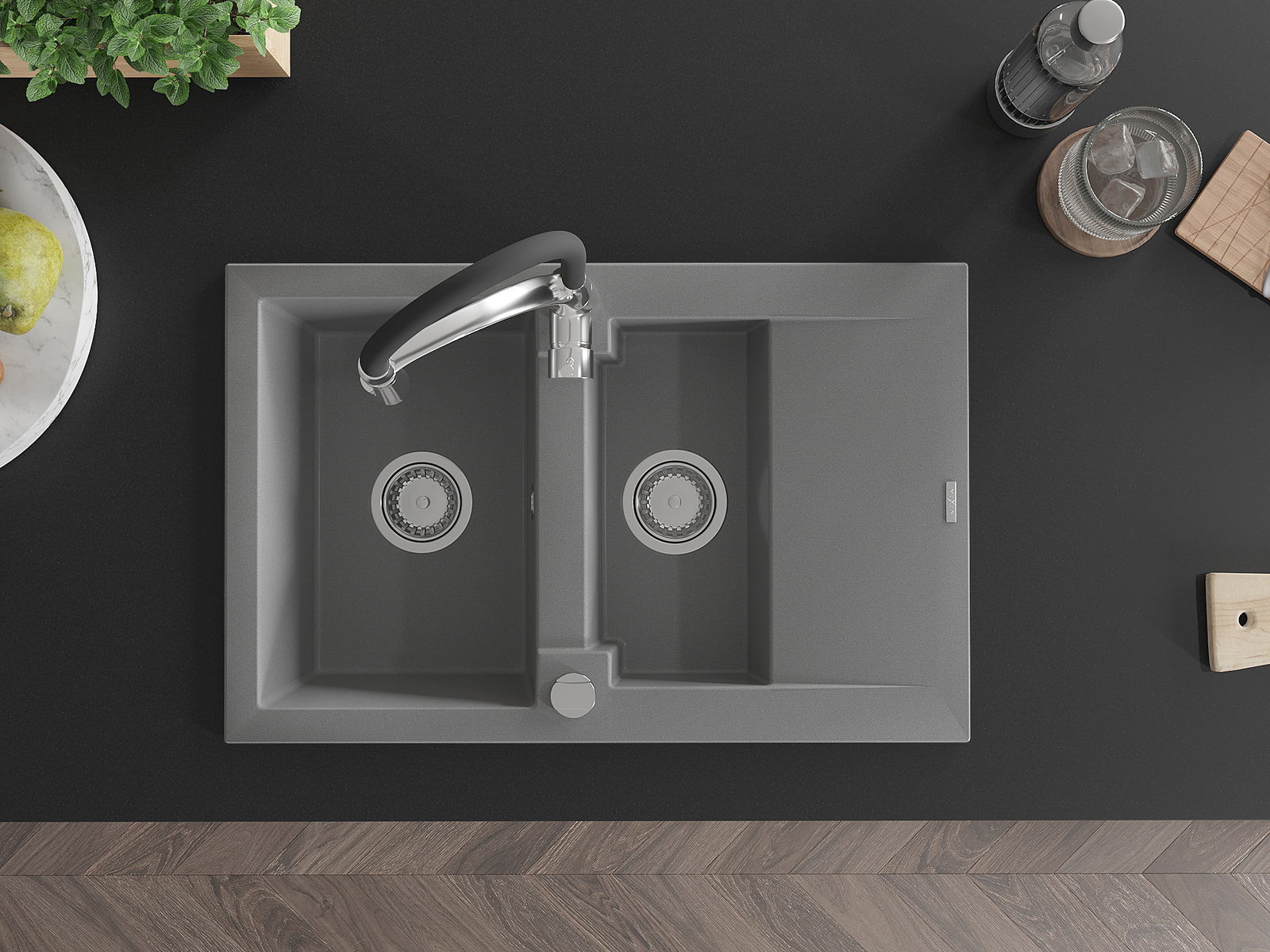 Mexen Gaspar granitizlietne trauku izlietne ar 1,5 nodalījumiem, novadītāju un virtuves krānu Aster, pelēka - 6507-71-73450-07