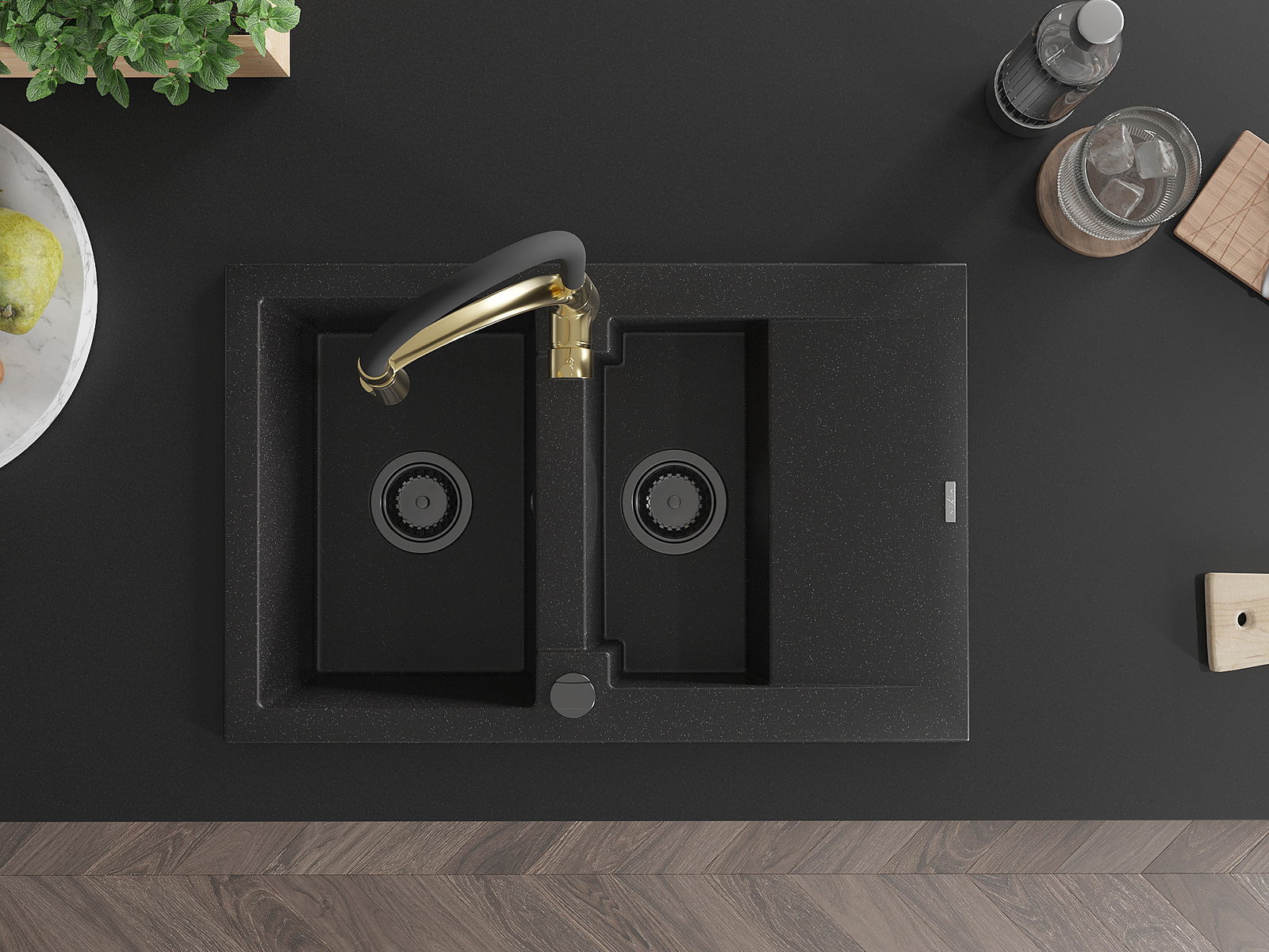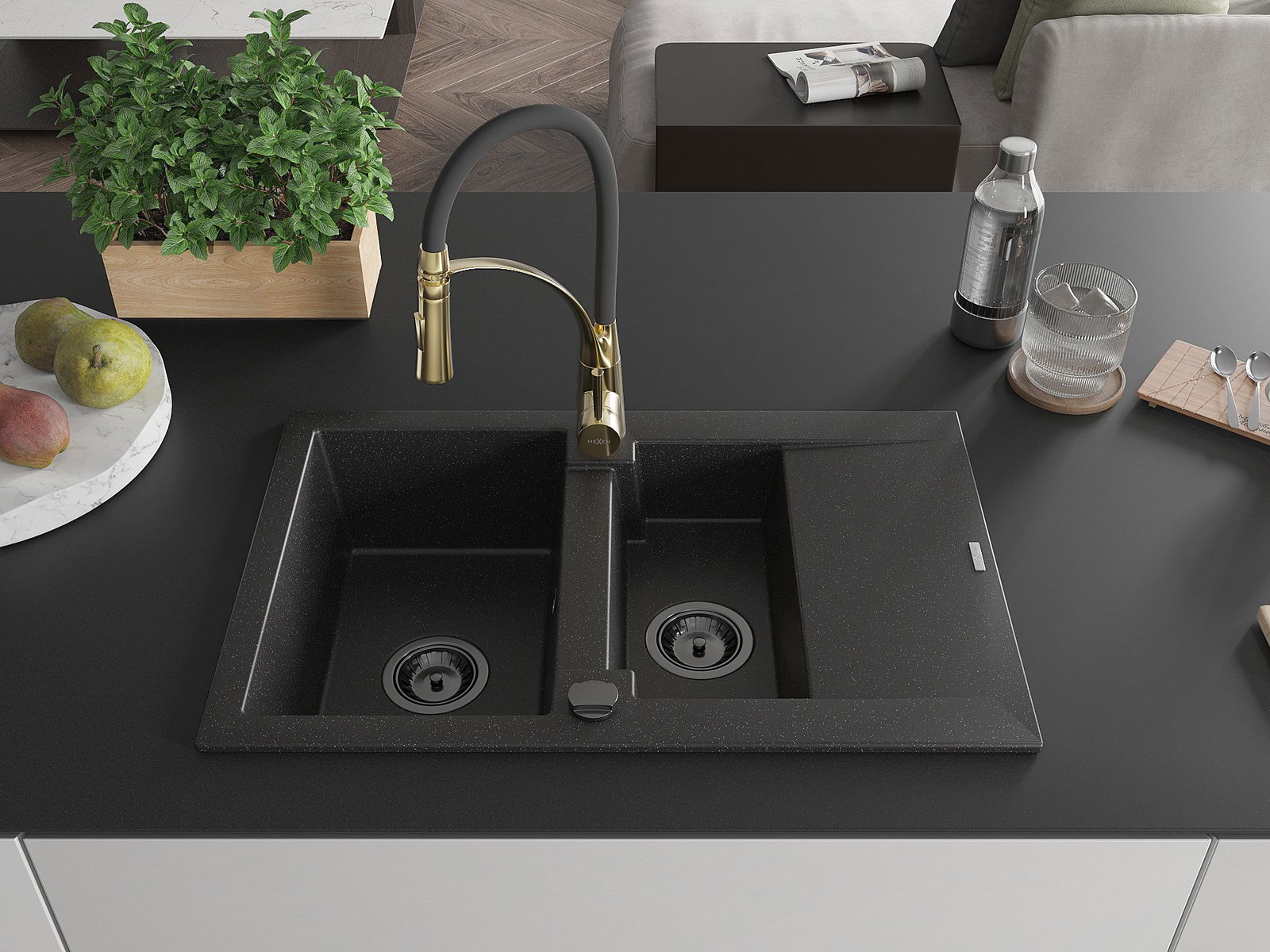 Mexen Gaspar granit izlietne ar 1,5 nodalījumu un noteces dēļa un virtuves jaucējkrānu Aster, melna/sudraba - 6507-73-73450-57-B