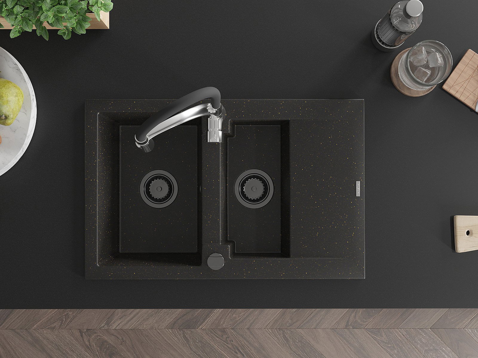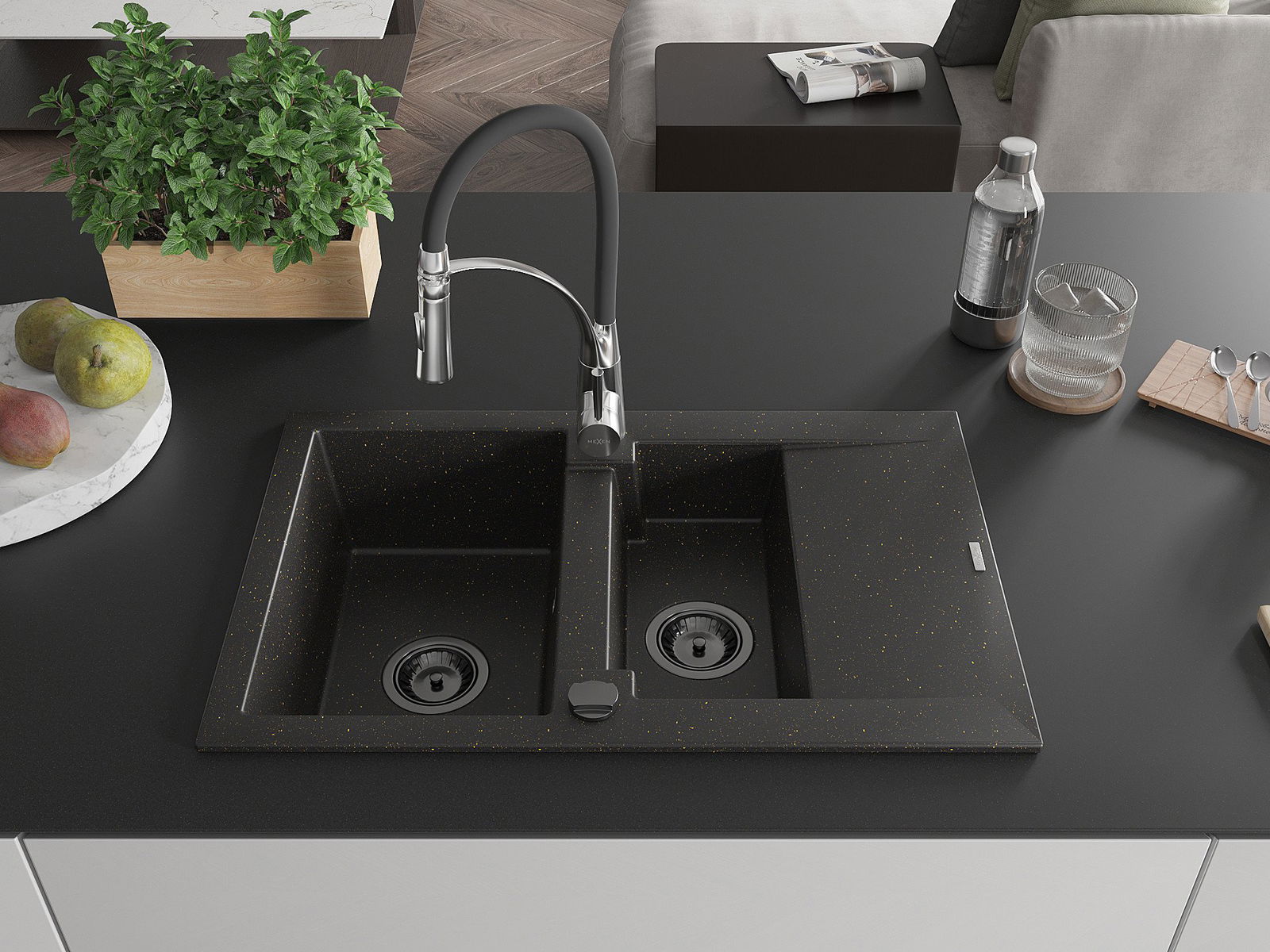 Mexen Gaspar granitizlietne 1,5 nodalījumu ar notekreni un virtuves jaucējkrānu Aster, melns/zeltains metālisks