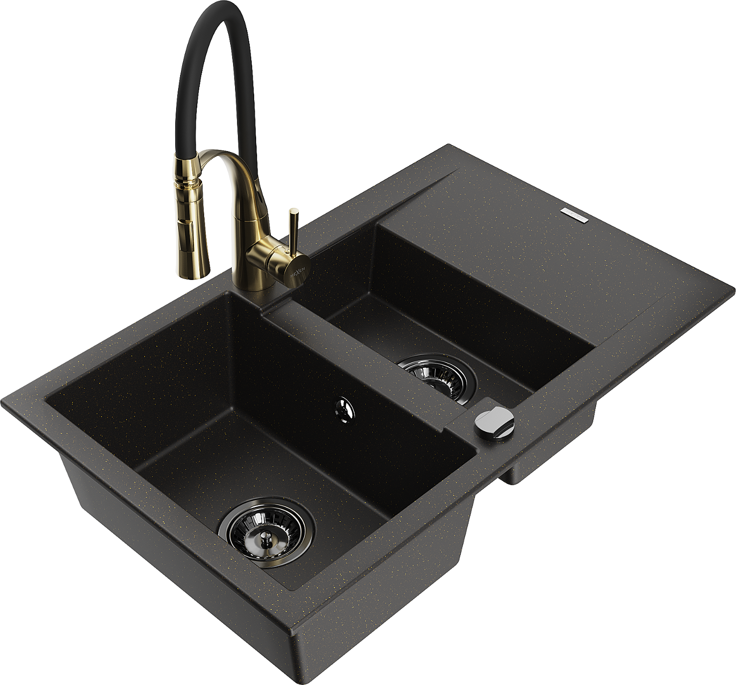 Mexen Gaspar granīta izlietne ar vienu un pusi nodalījumu, ar noteku un virtuves jaucējkrānu Aster, melna/zeltīta metālika