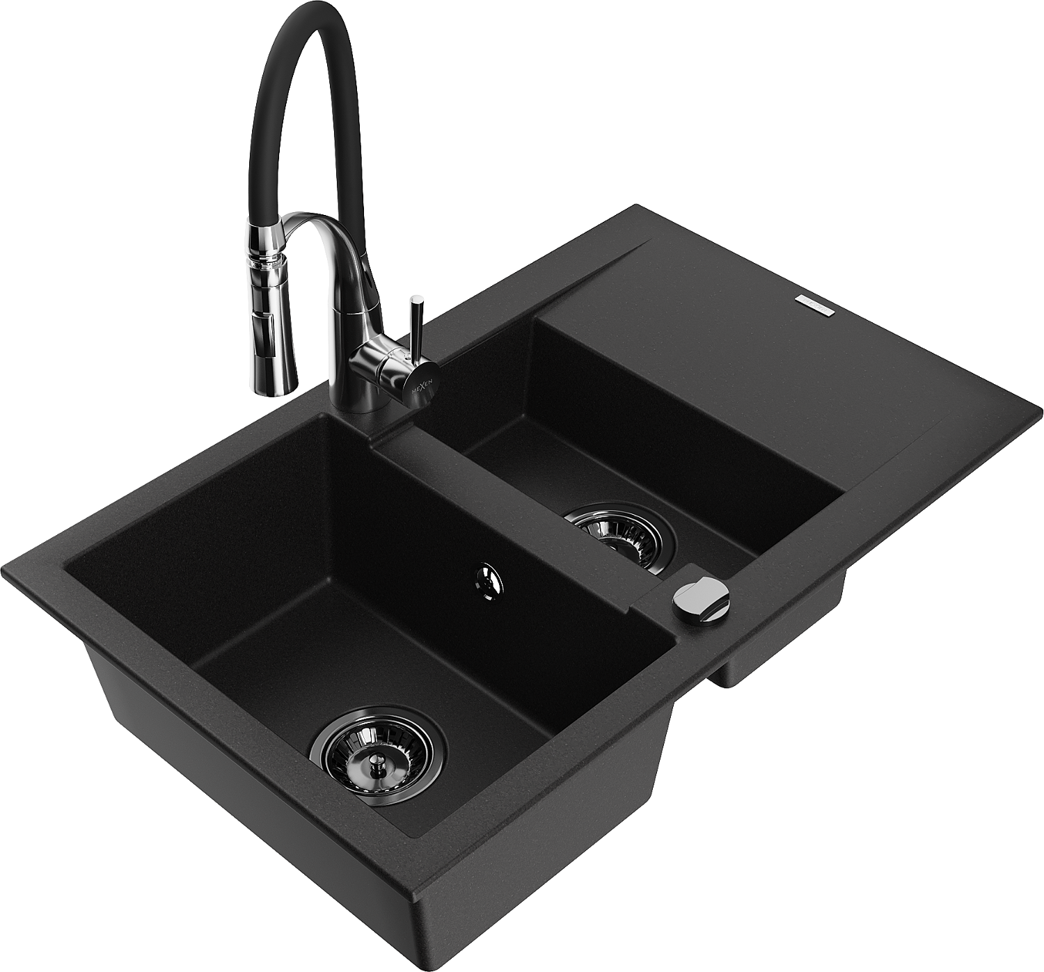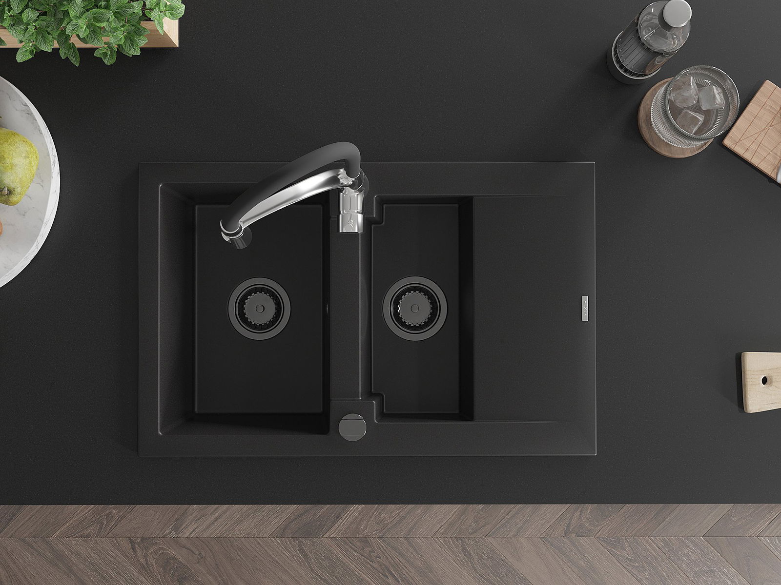 Mexen Gaspar granitais izlietne 1,5 nodalījumu ar noteku un virtuves jaucējkrānu Aster, melna - 6507-77-73450-07-B