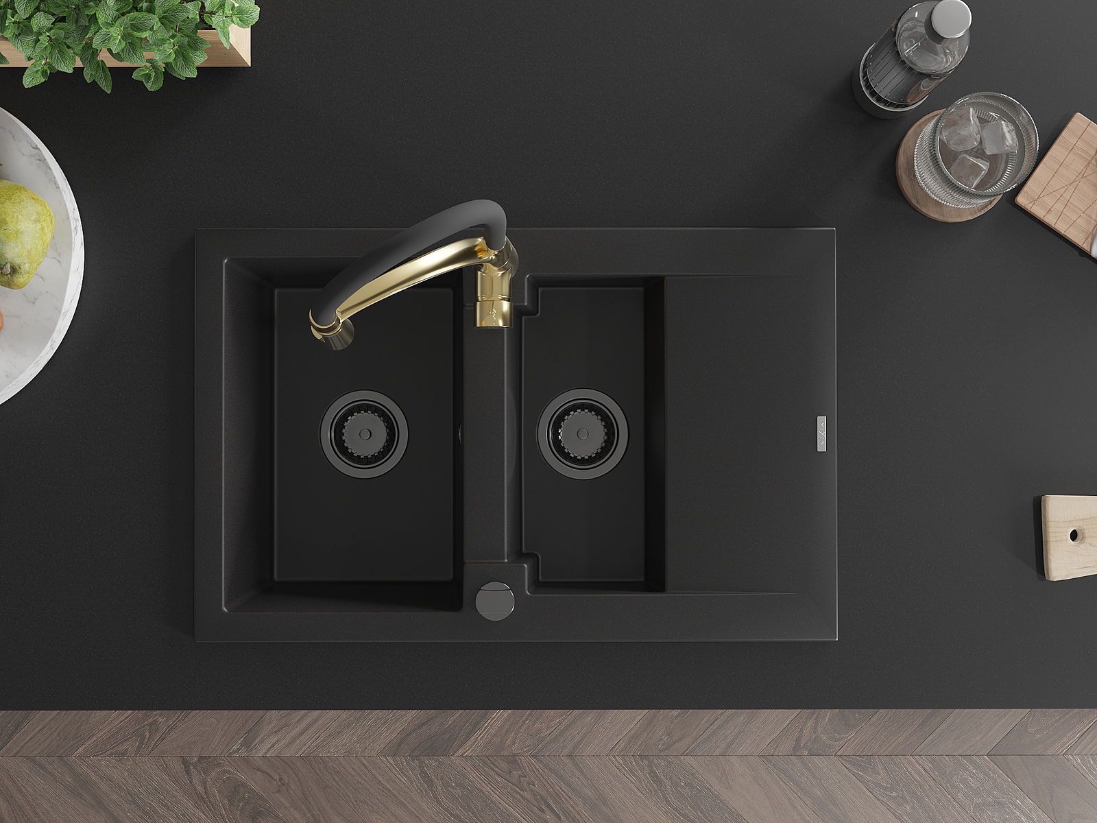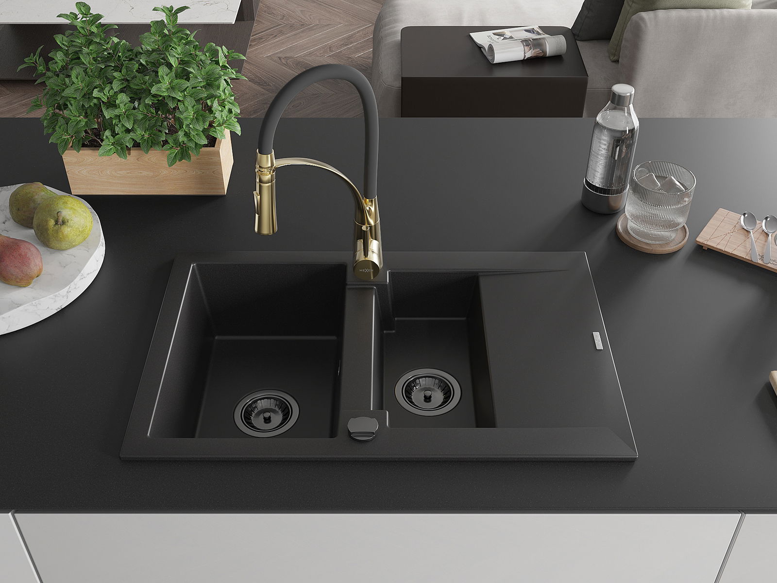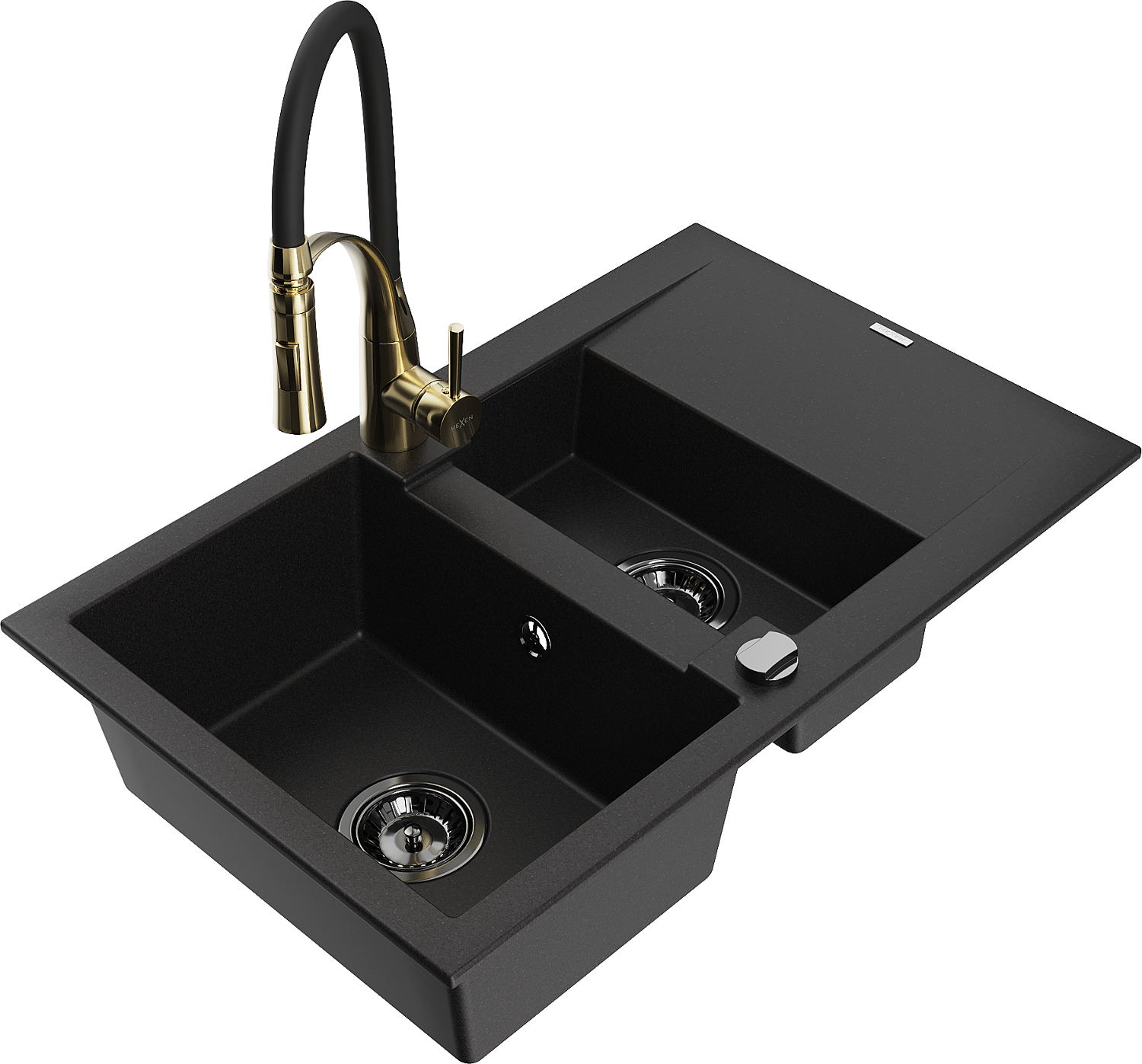 Mexen Gaspar granīta izlietne ar 1,5 kamerām un noteku, ar virtuvess krānu Aster, melna - 6507-77-73450-57-B