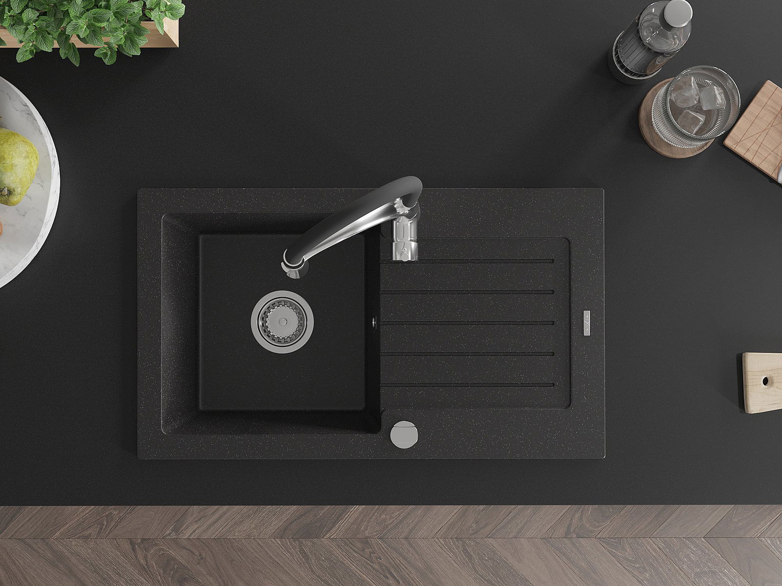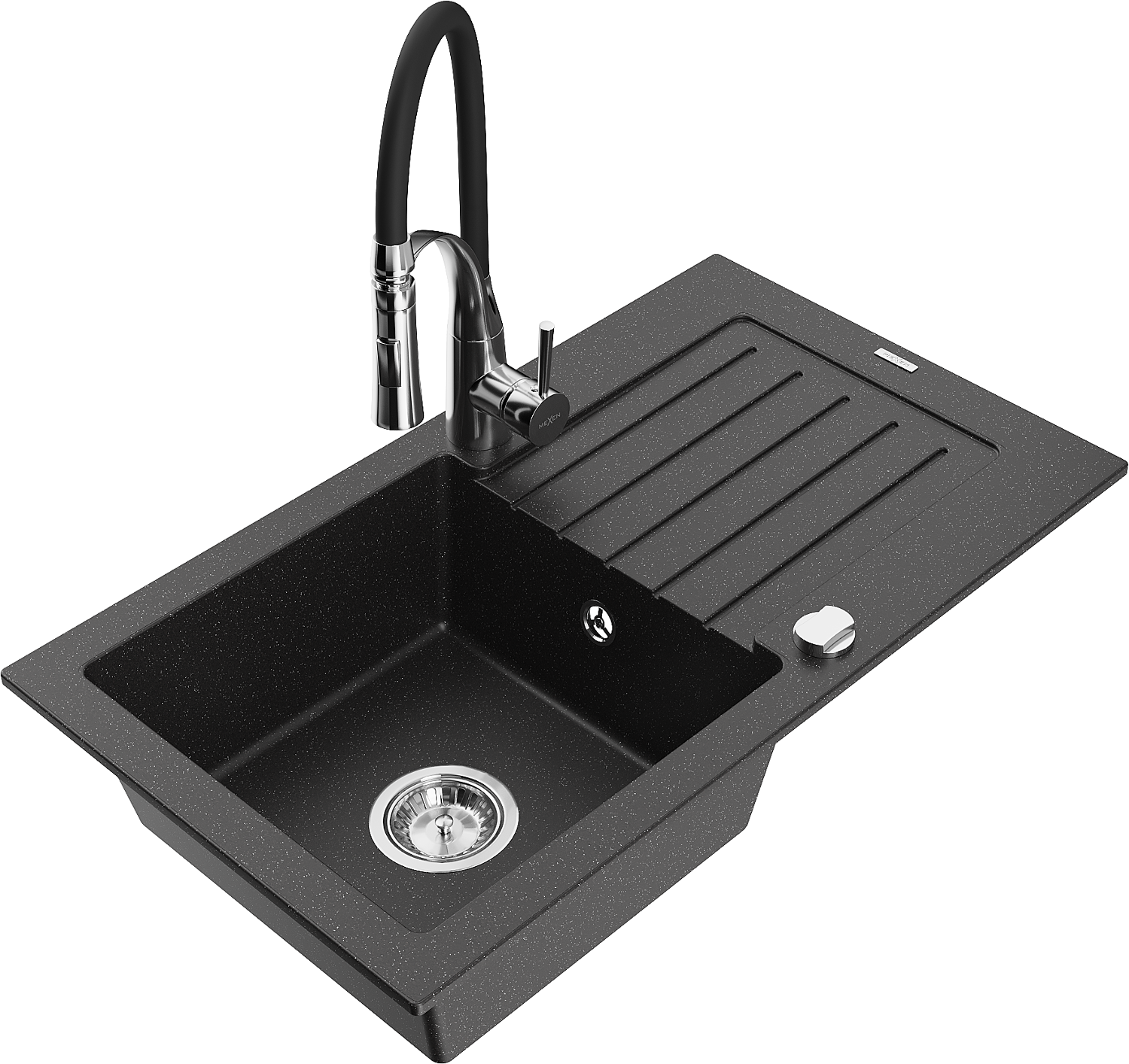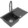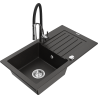 Mexen Pablo granīta izlietne ar vienu bļodu, noteku un virtuves jaucējkrānu Aster, melns/sudraba metāliks