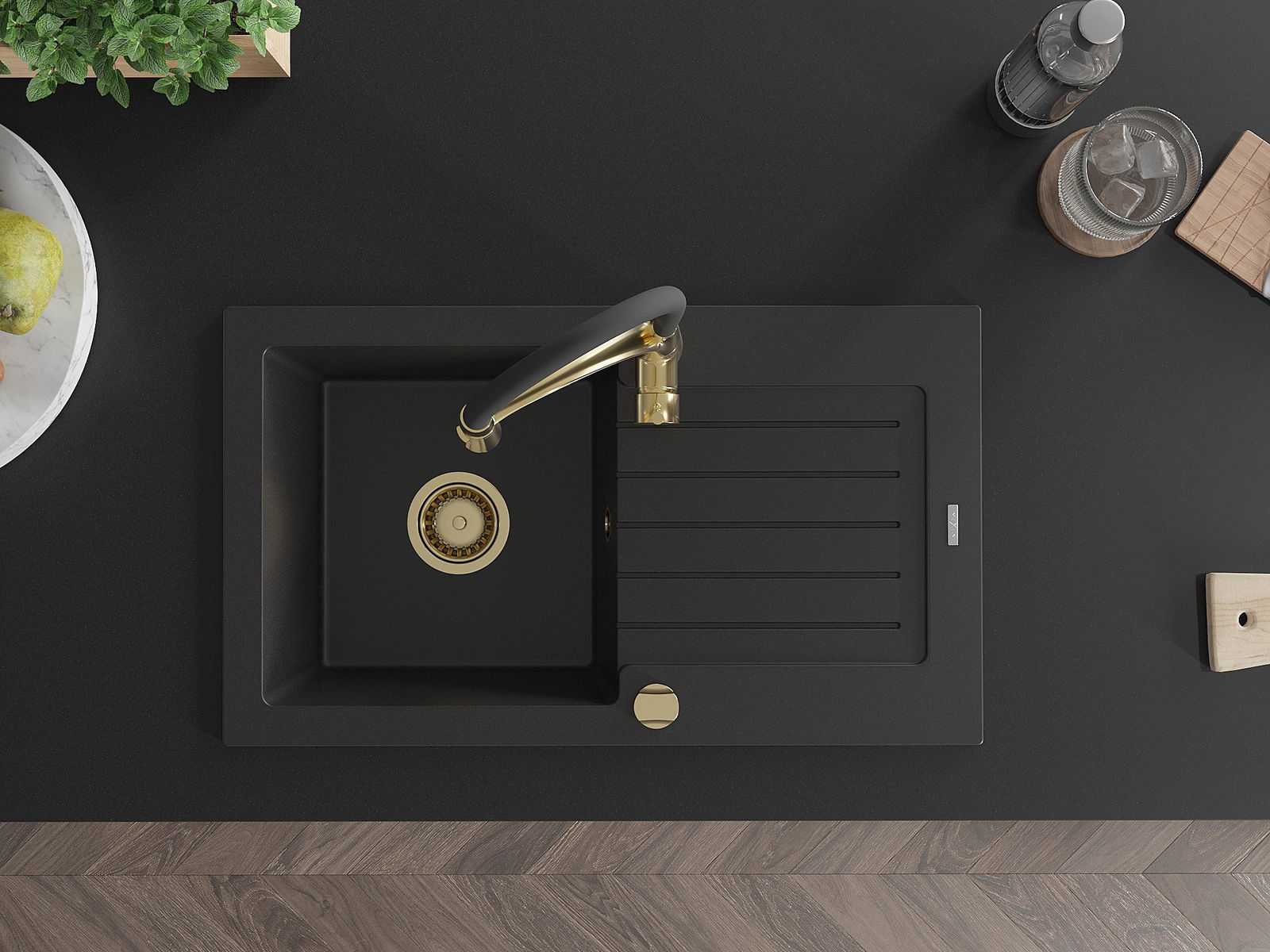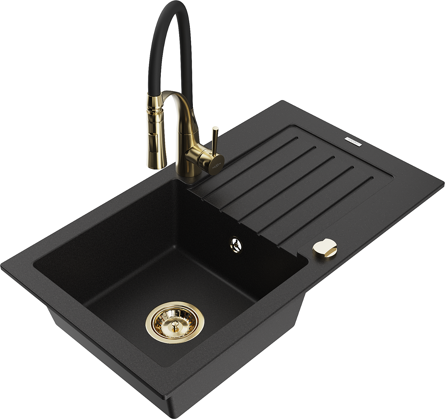 Mexen Pablo granīta izlietne ar 1 nodalījumu, noteces un virtuves jaucējkrānu Aster, melna - 6510-77-73450-57-G