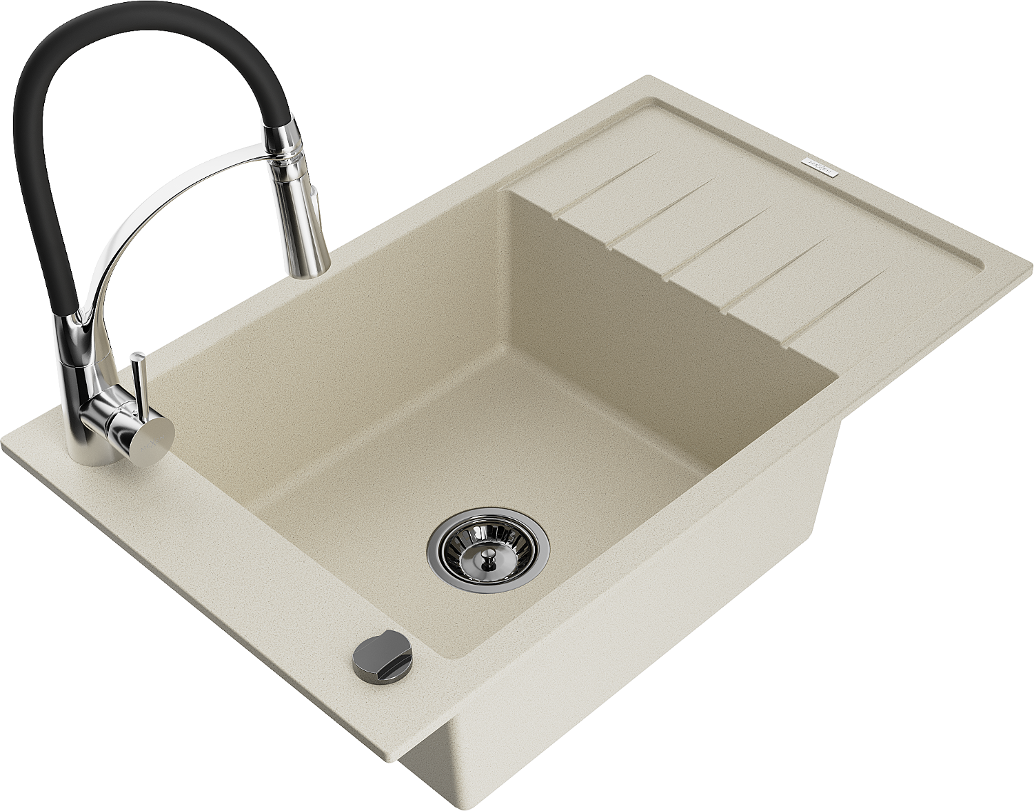 Mexen Elias granitā izlietne ar vienu nodalījumu, notecināšanas pludni un virtuves jaucējkrānu Aster, bēša - 6511-69-73450-07-B