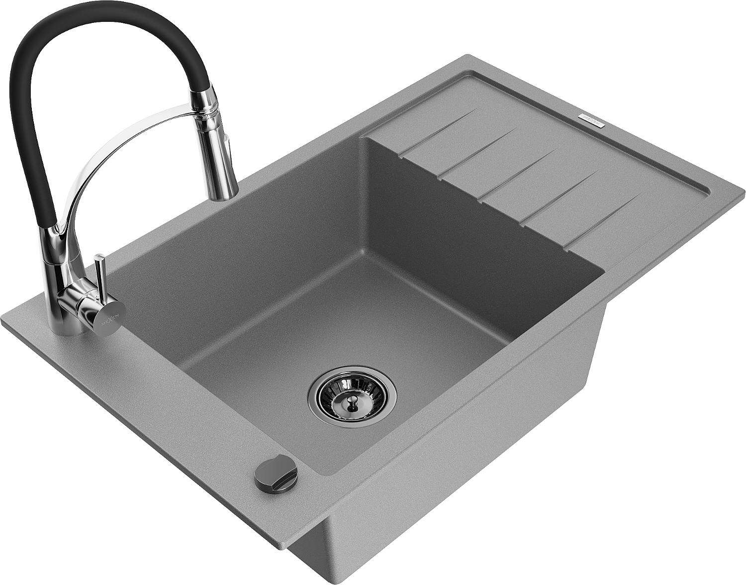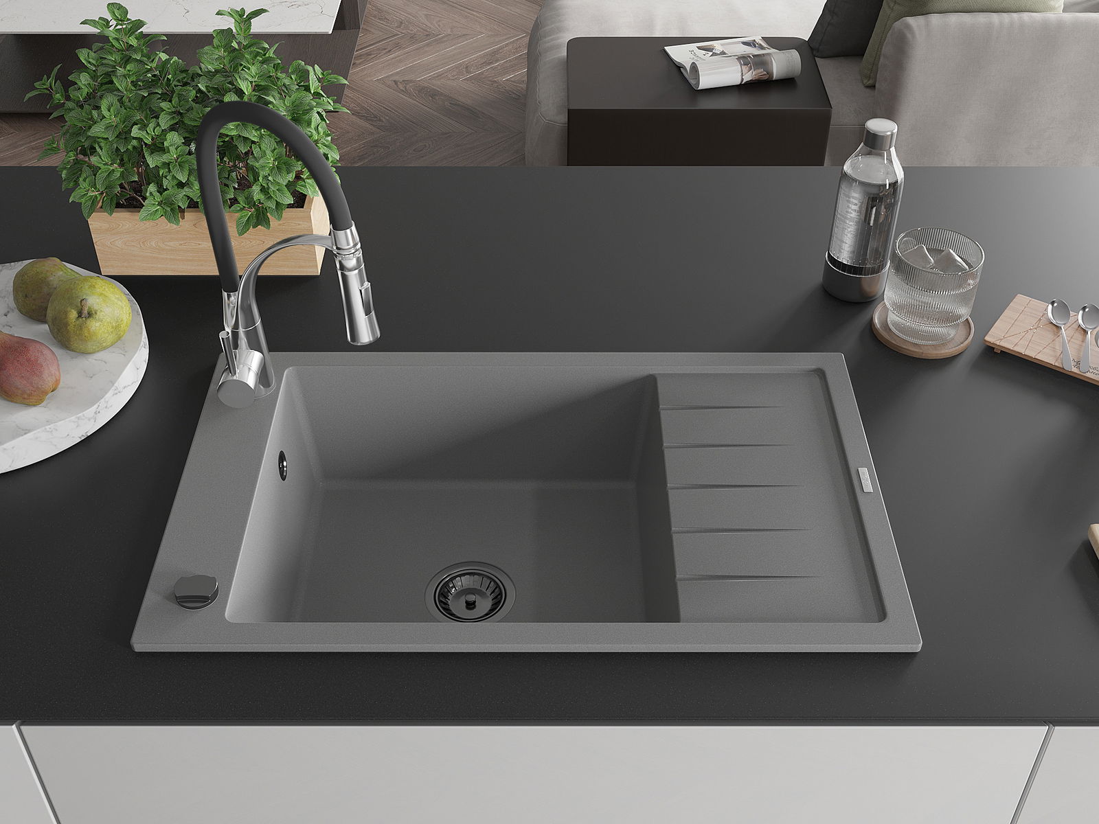 Mexen Elias granit izlietne ar 1 nodalījumu, notekreni un virtuves jaucējkrānu Aster, pelēka - 6511-71-73450-07-B