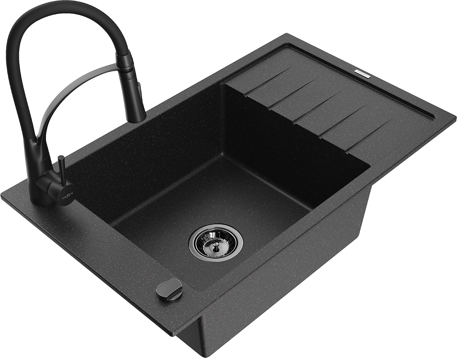 Mexen Elias 1-nodalgranīta izlietne ar noteces vietu un virtuves jaucējkrānu Aster, melns/sudrabots metālisks