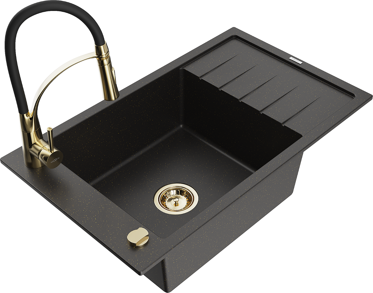 Mexen Elias granitizlietne 1-nodala ar noplūdi un virtuves jaucējkrānu Aster, melns/zeltains metālisks - 6511-75-73450-57-G