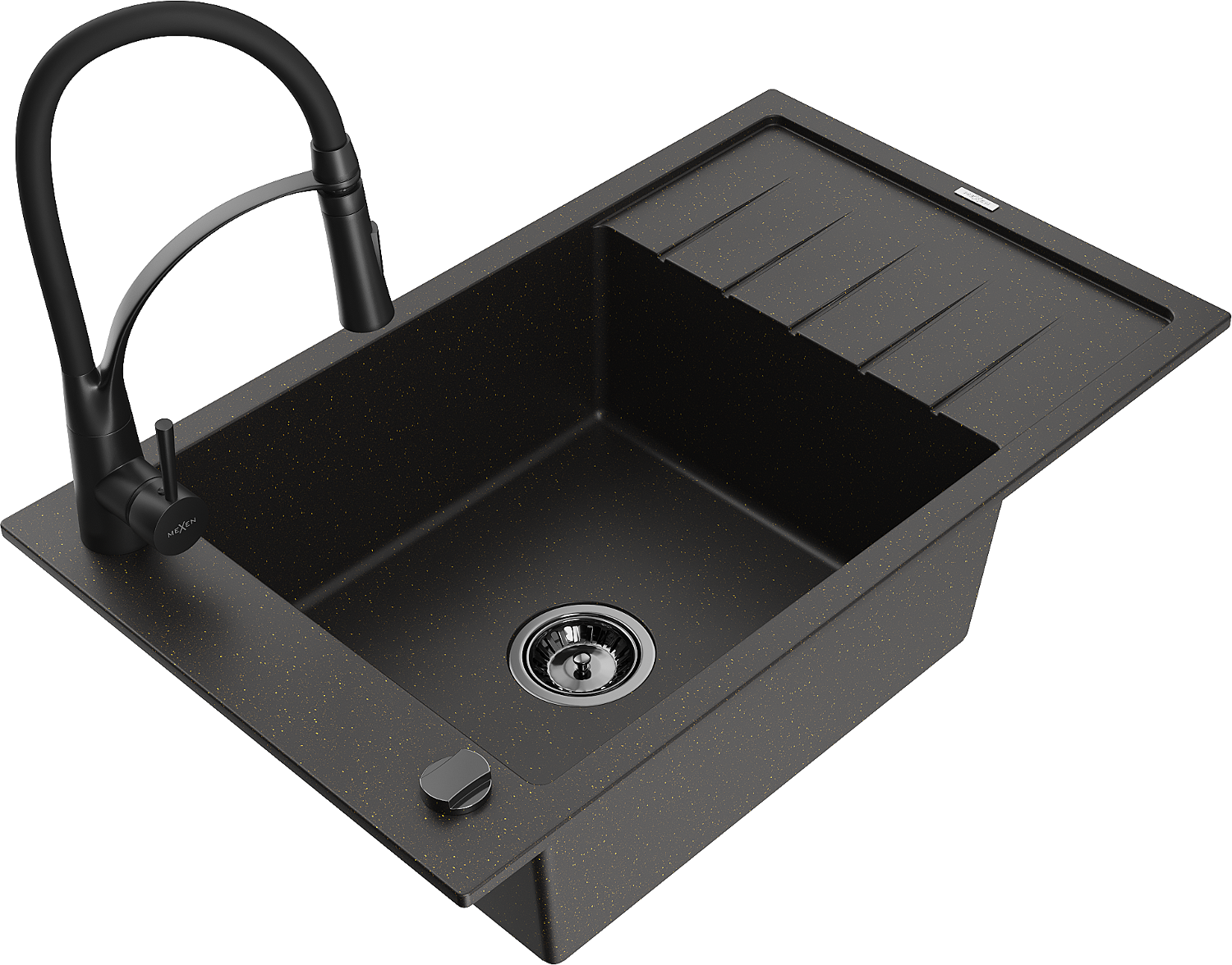 Mexen Elias granitais izlietne ar vienu nodalījumu ar noteces virsmu un virtuves krānu Aster, melna/zeltīta metālika