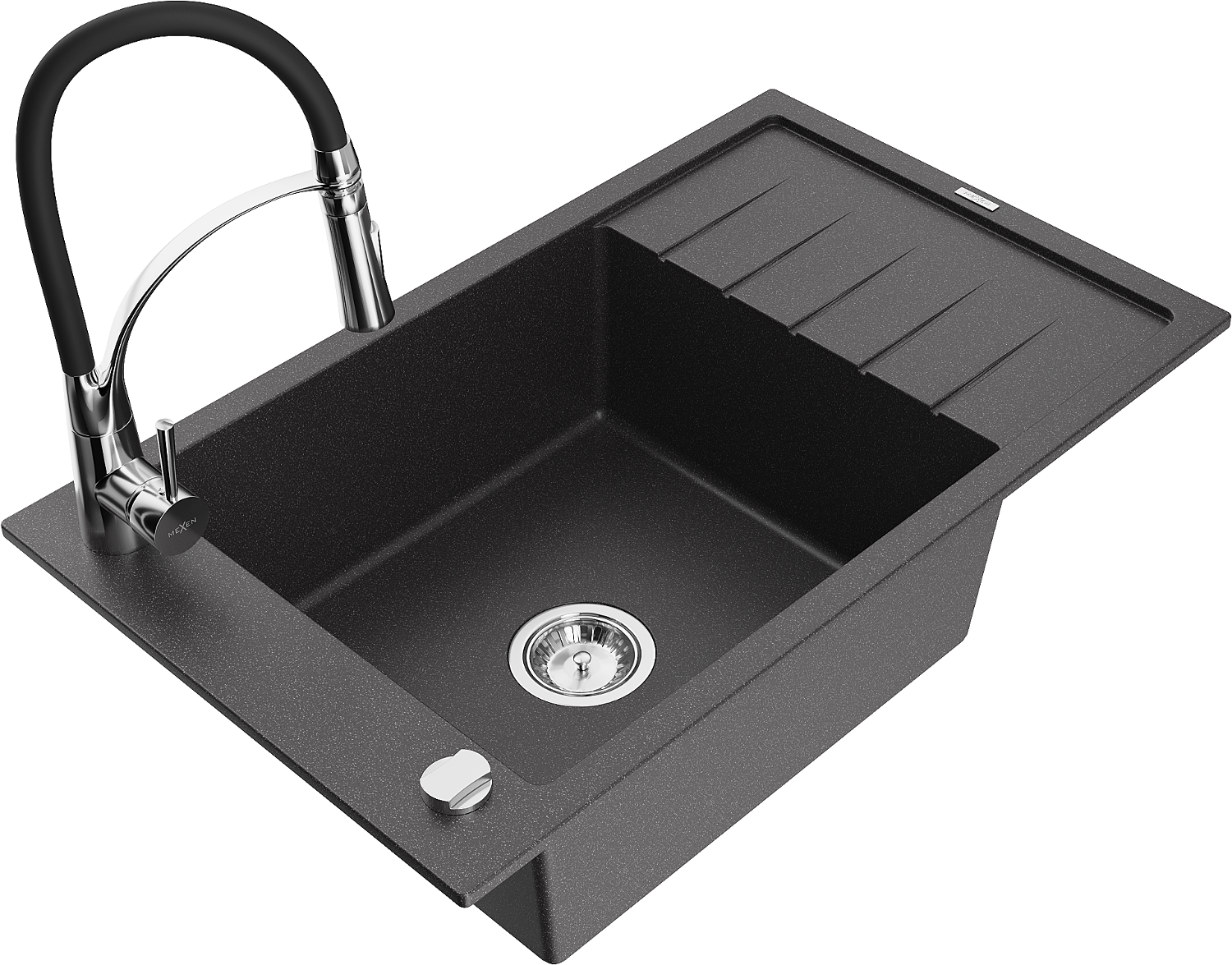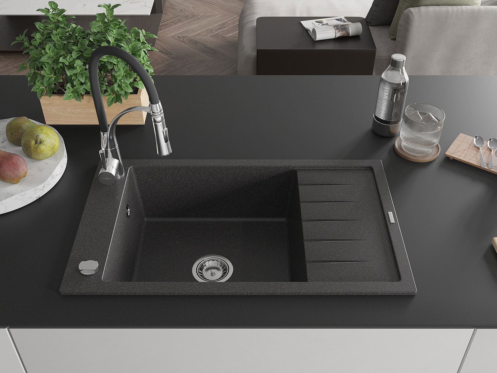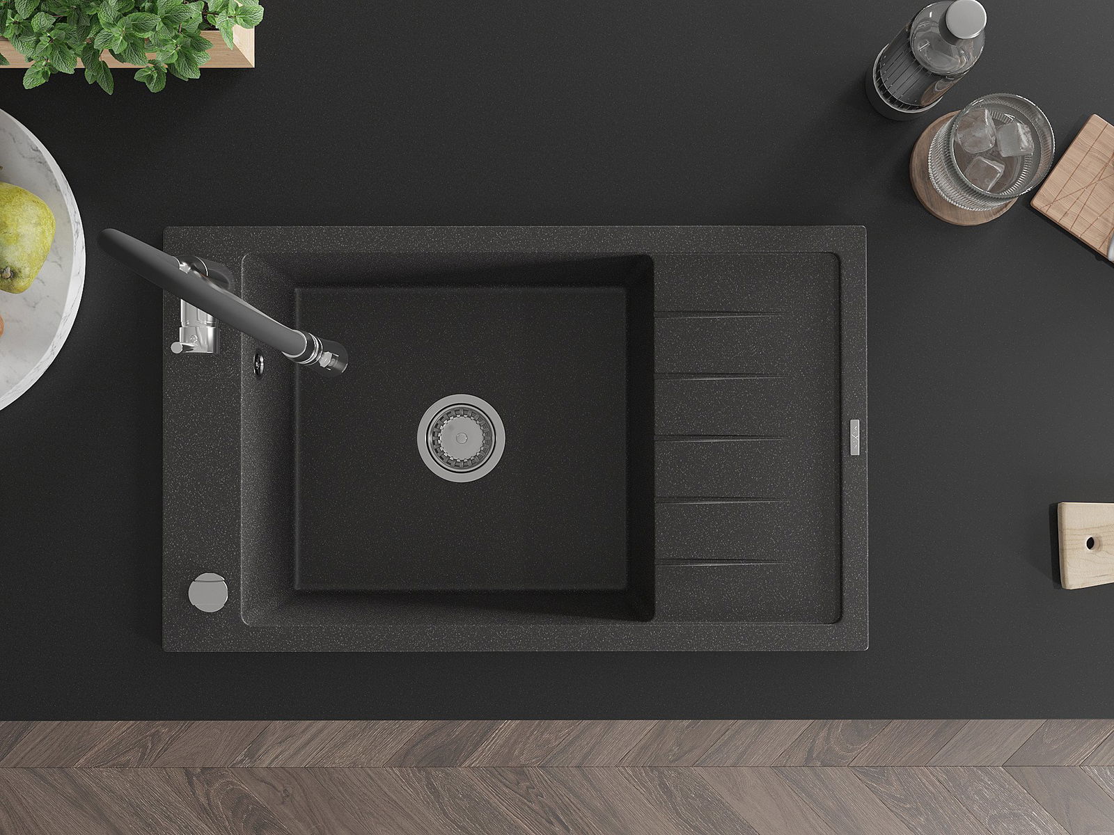 Mexen Elias 1-kameru granīta izlietne ar noteci un virtuves jaucējkrānu Aster, melni punktots - 6511-76-73450-07