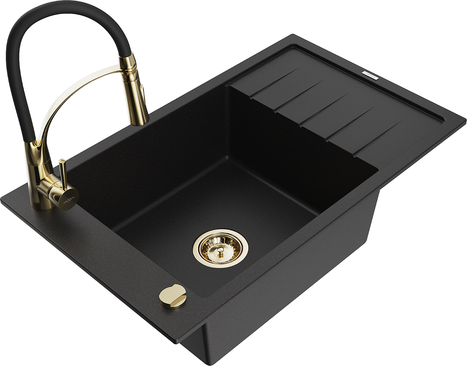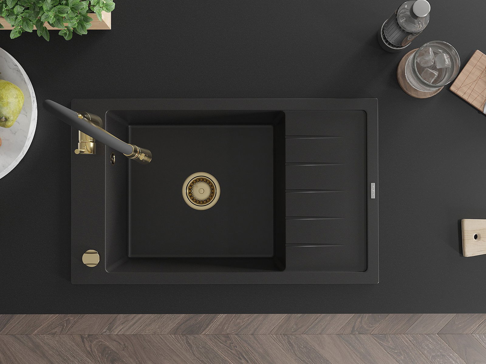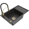 Mexen Elias granit izlietne ar 1 nodalījumu, notecināšanas paneli un virtuves jaucējkrānu Aster, melna - 6511-77-73450-57-G