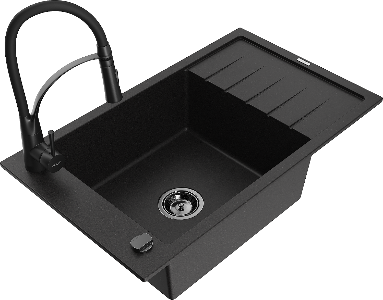 Mexen Elias granitēta izlietne ar vienu kameru, pilienpaliktni un virtuves jaucējkrānu Aster, melna - 6511-77-73450-70-B