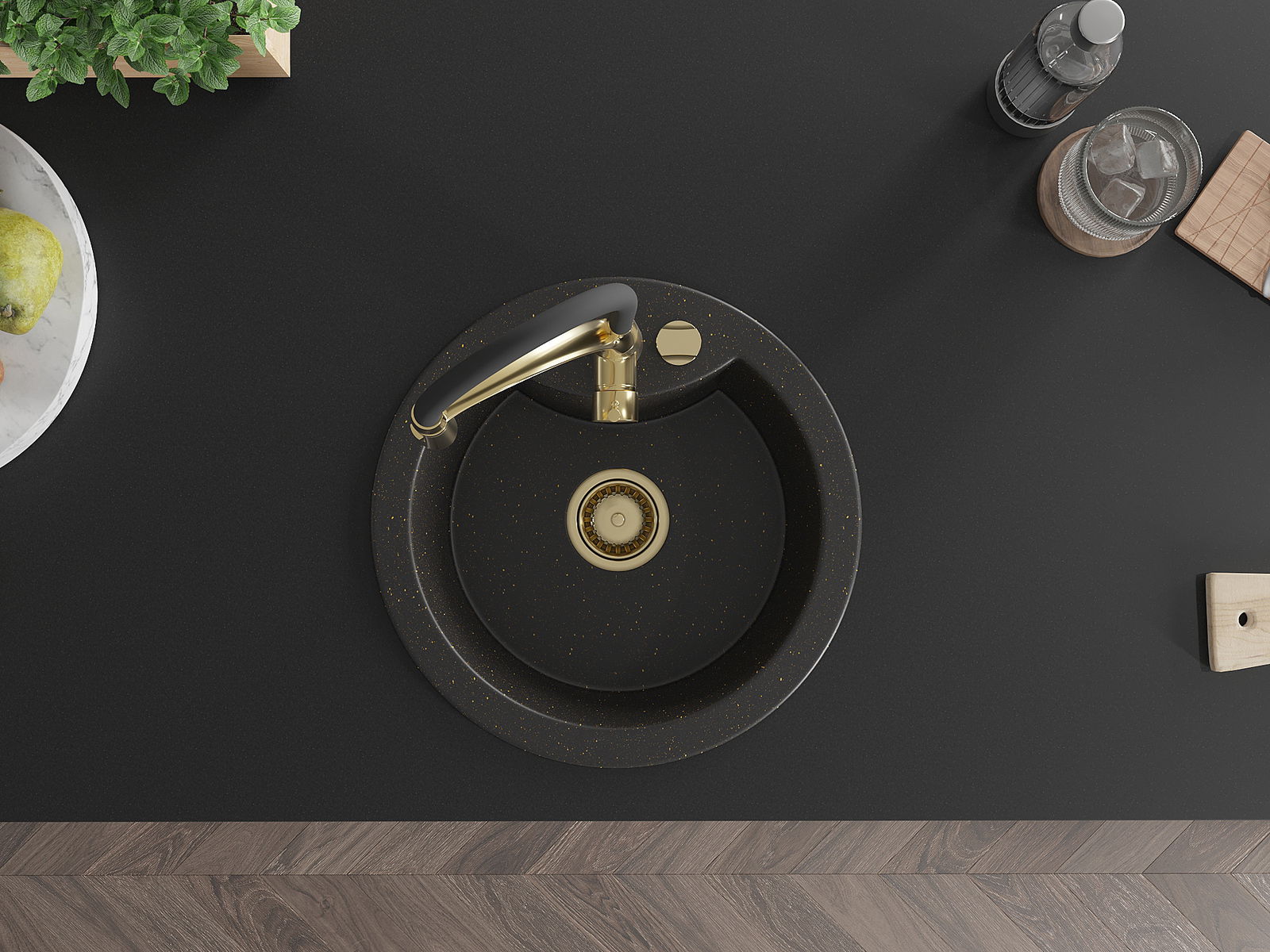Mexen Diego granitizlietne ar vienu nodalījumu un Aster virtuves jaucējkrānu, melns/zelta metāliskais - 6512-75-73450-57-G