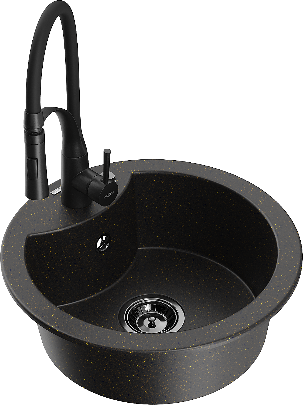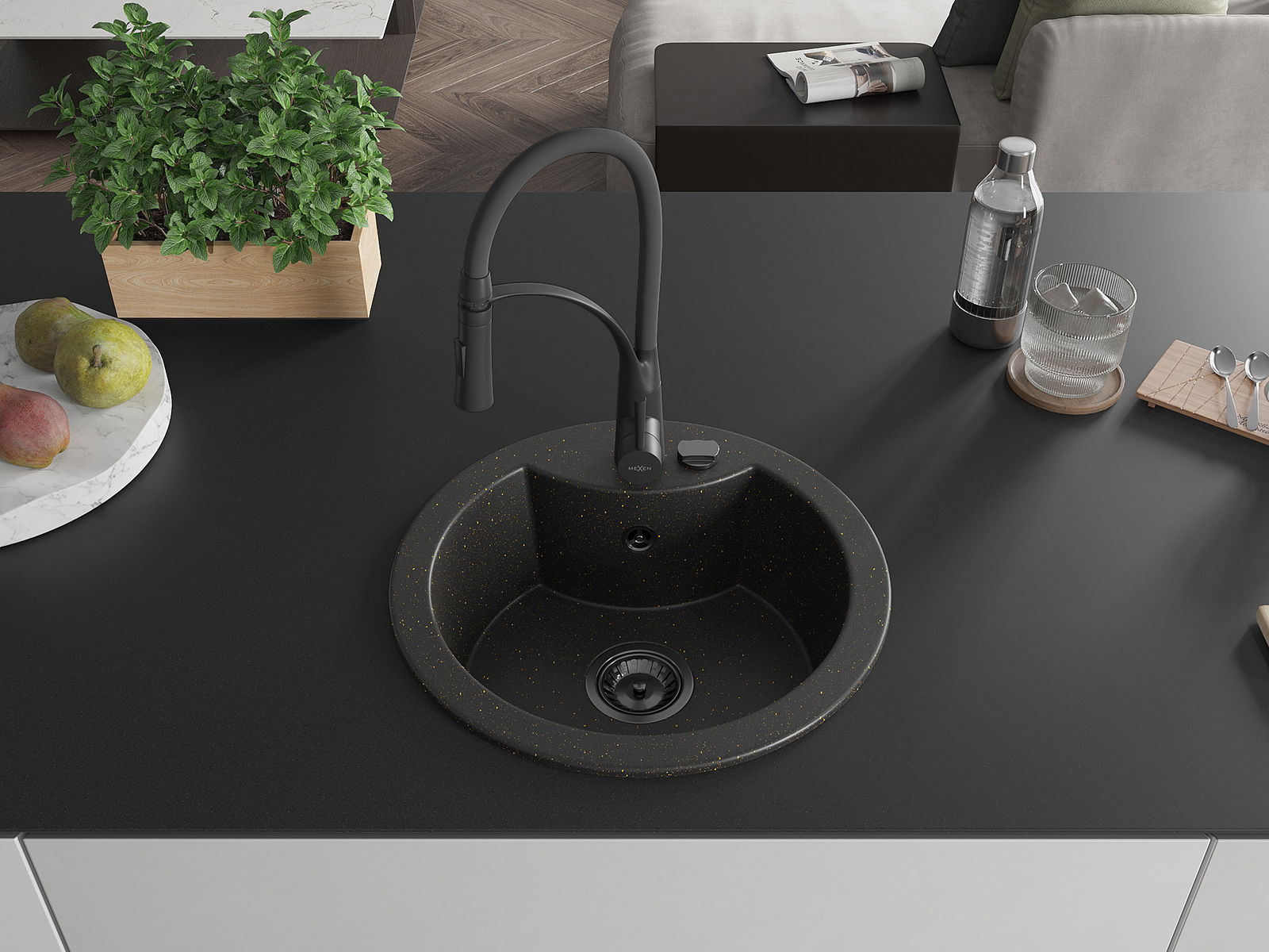 Mexen Diego granitā izlietne ar vienu nodalījumu ar virtuves jaucējkrānu Aster, melns/zeltains metāliskais - 6512-75-73450-70-B
