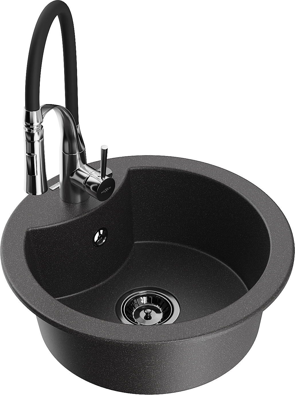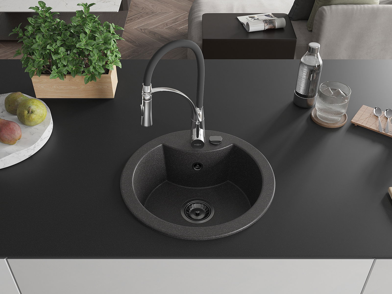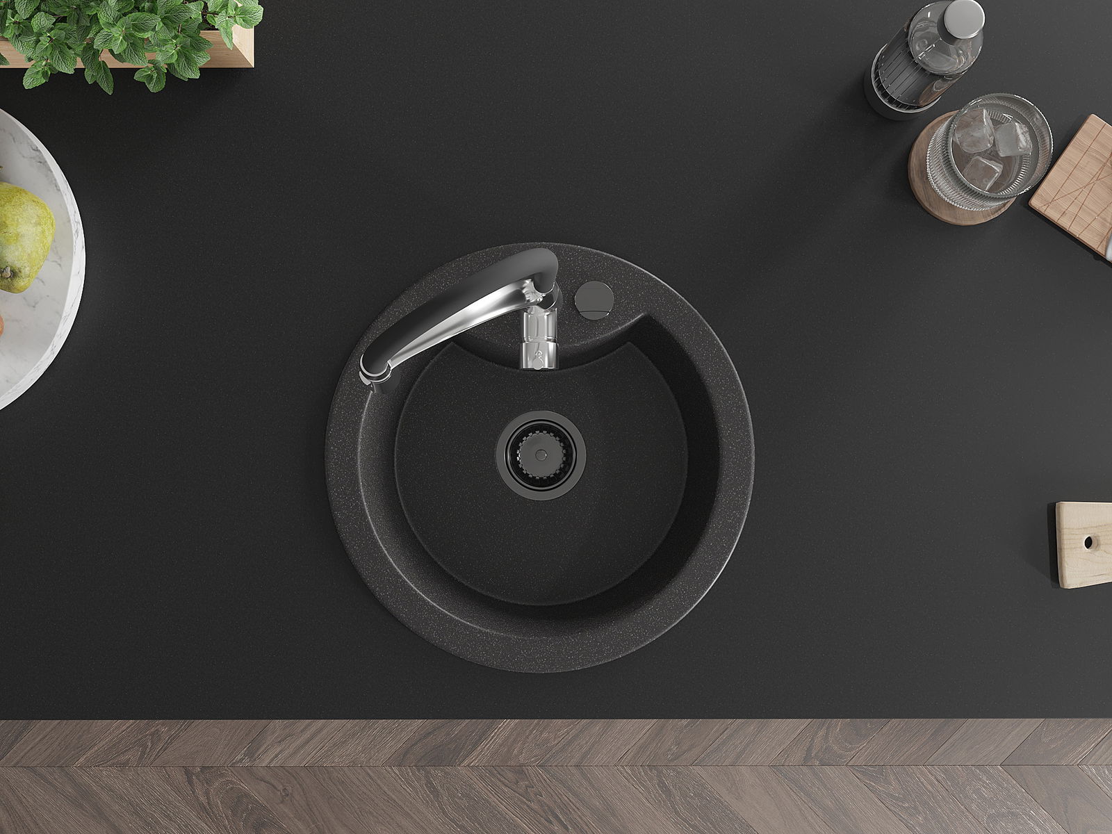 Mexen Diego granit izlietne ar 1 nodalījumu un virtuves jaucējkrānu Aster, melna ar punktiem - 6512-76-73450-07-B
