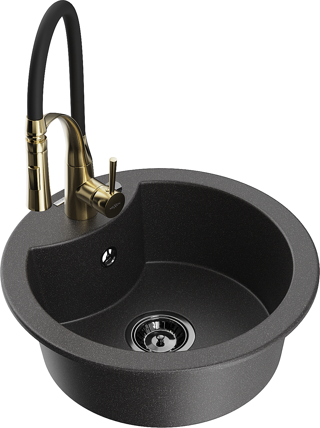 Mexen Diego granīta izlietne ar 1 nodalījumu un virtuves jaucējkrānu Aster, melna, plankumaina - 6512-76-73450-57-B
