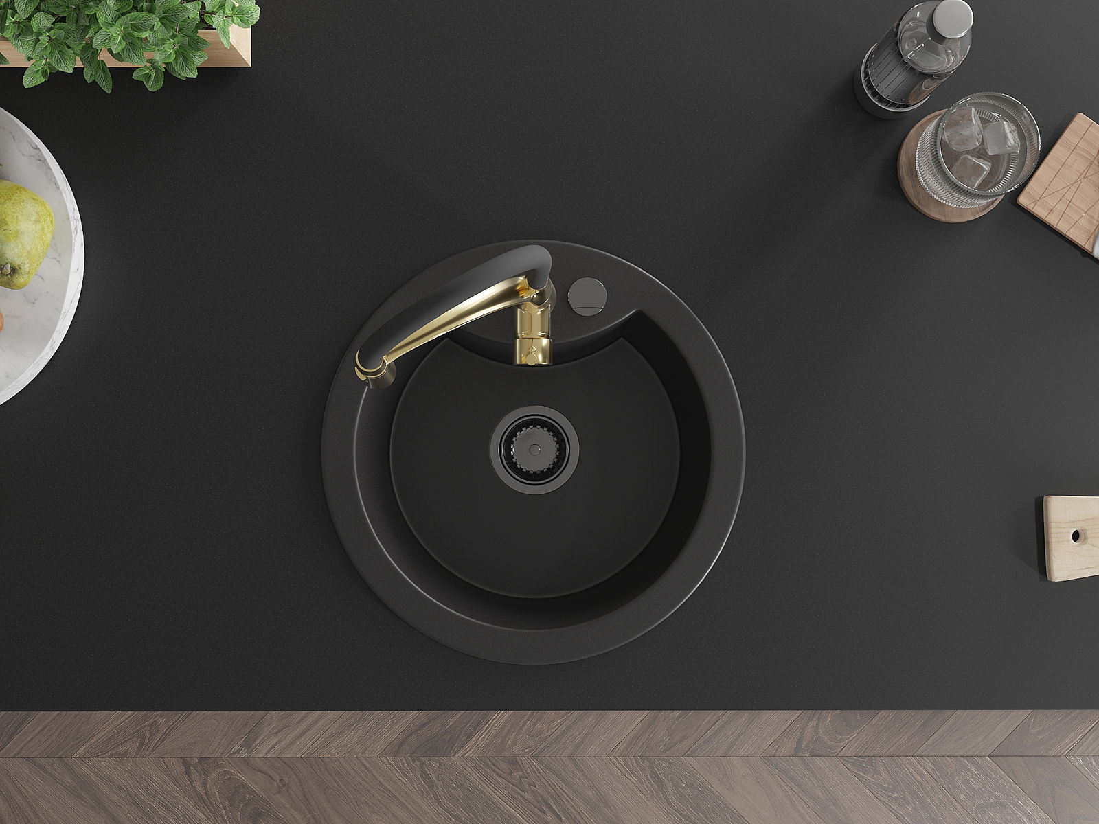 Izlietnei ir padziļināts caurums ar diametru 35 mm, kuru varat izsist patstāvīgi. To var izmantot, piemēram, šķidruma dozatora uzstādīšanai, kas novērsīs plastmasas pudeļu klātbūtni virtuvē un piešķirs tai elegantu apdari.