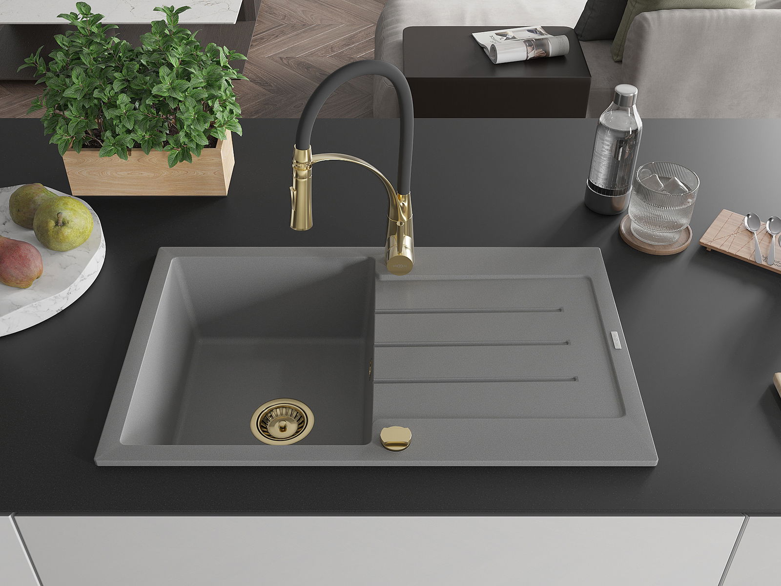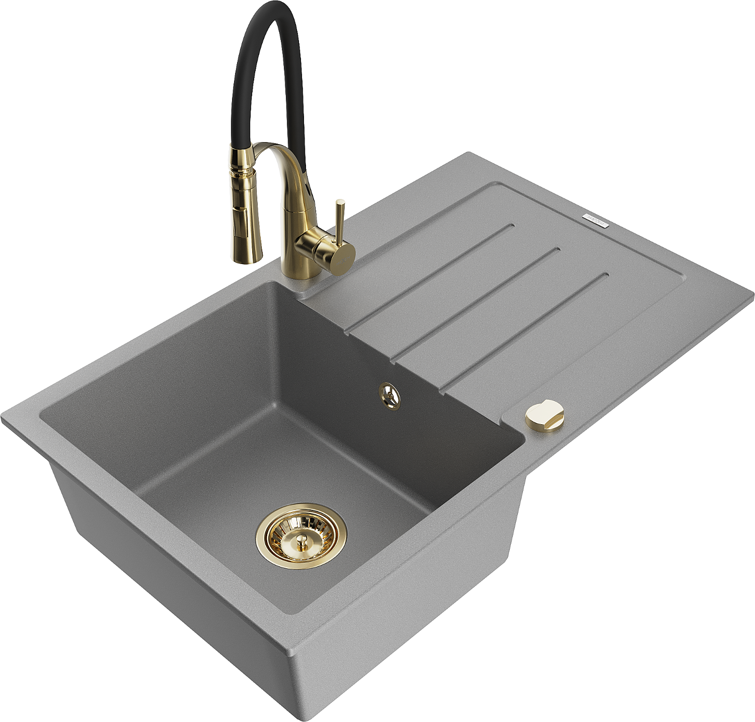 Mexen Bruno granitizlietne ar vienu nodalījumu, pilinātāju un virtuves jaucējkrānu Aster, pelēks - 6513-71-73450-57-G
