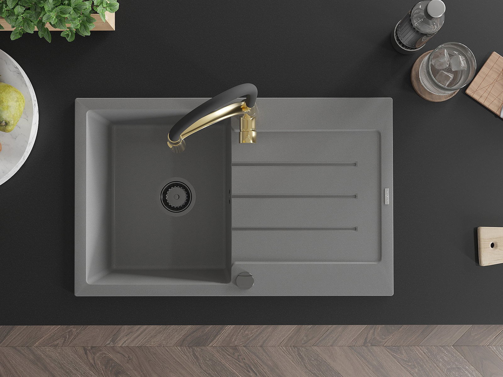 Mexen Bruno granit izlietne ar 1 nodalījumu, notecēs un virtuves bateriju Aster, pelēka - 6513-71-73450-57-B