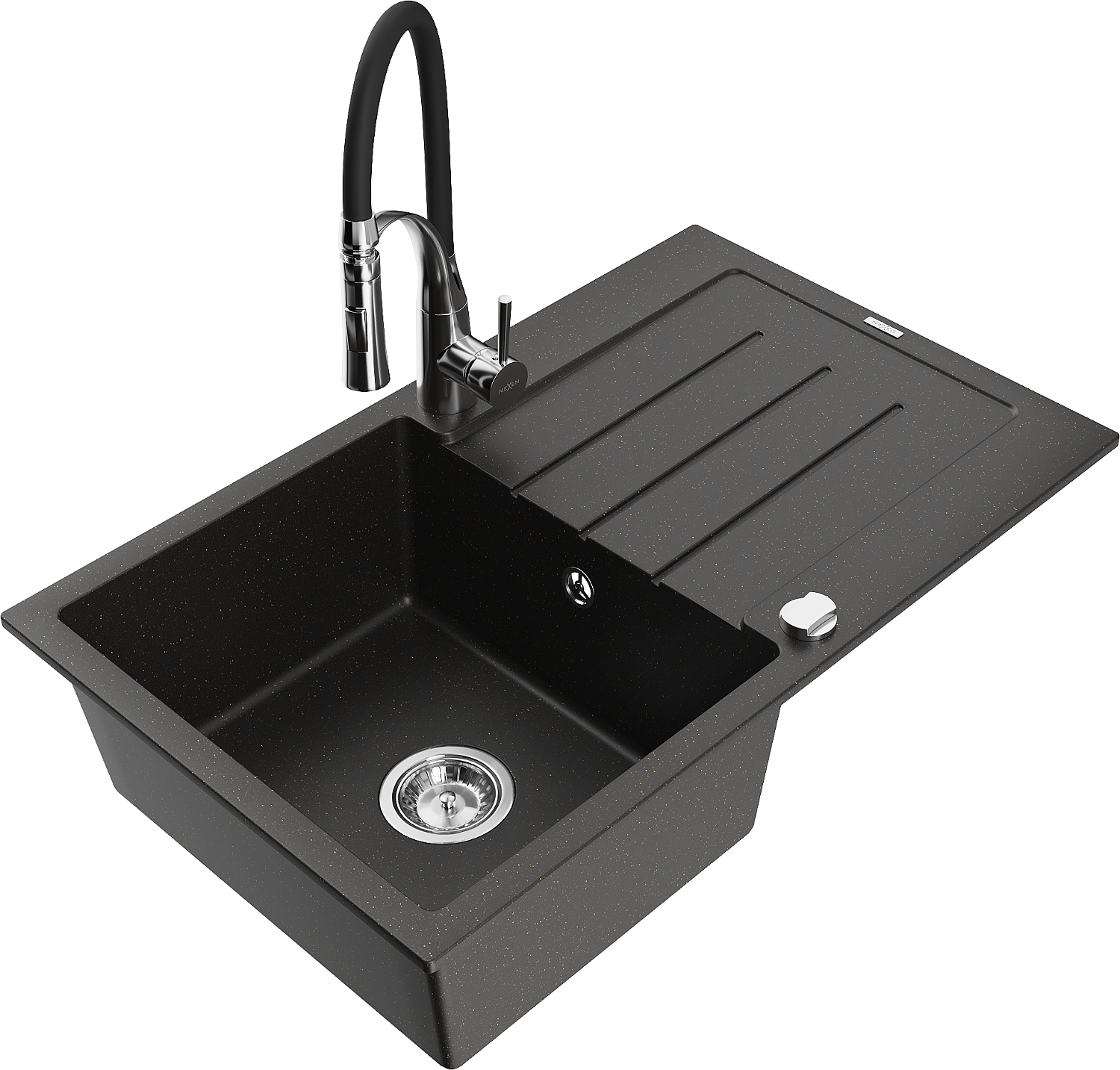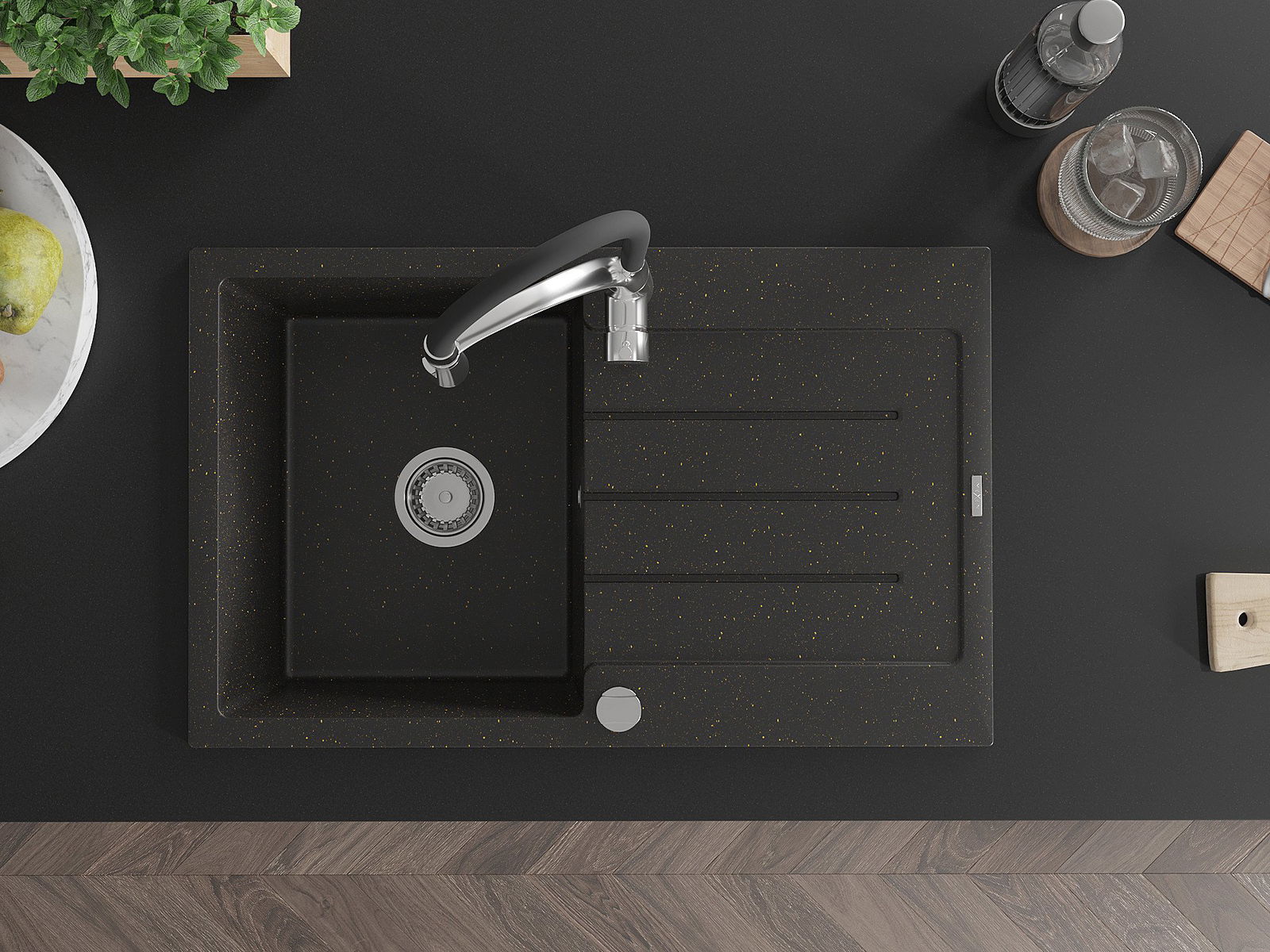 Mexen Bruno granitizlietne ar vienu nodalījumu ar noteku un virtuves jaucējkrānu Aster, melns/zelta metāliks