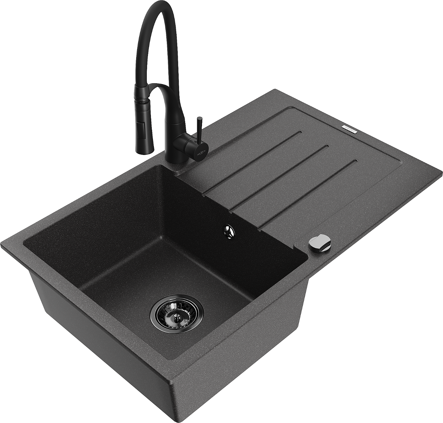 Mexen Bruno granitizlietne 1-nodalne ar noteka un virtuvnes jaucējkrānu Aster, melnā krāsā ar punktiem - 6513-76-73450-70-B