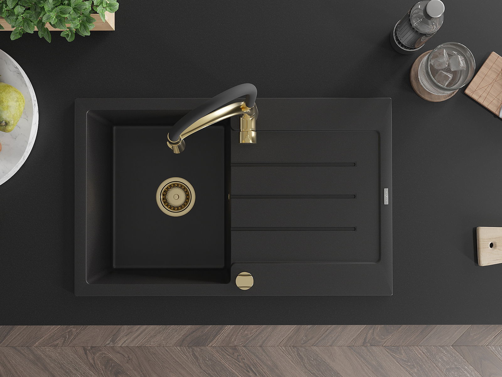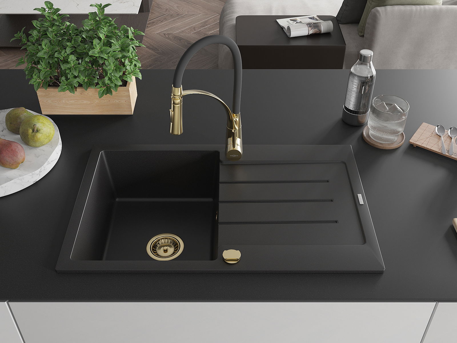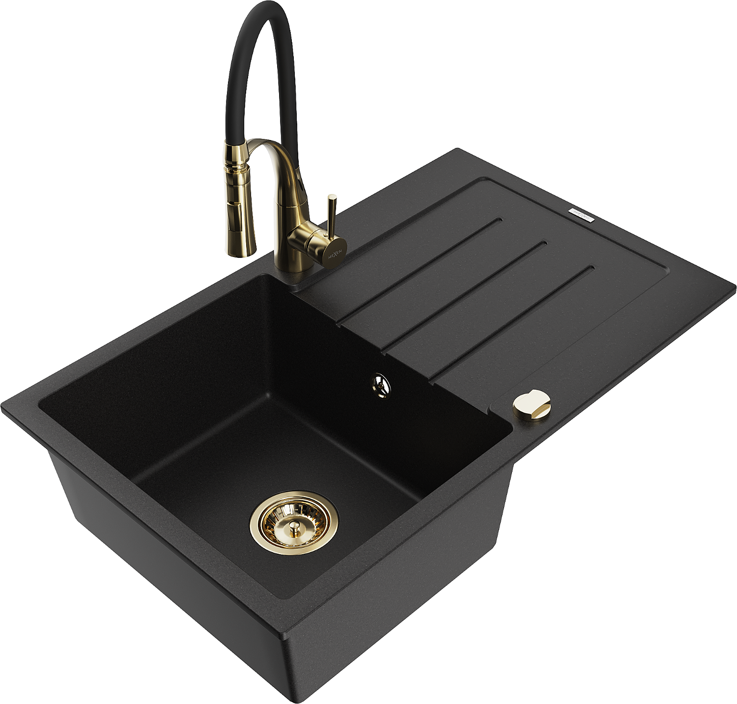 Mexen Bruno granit izlietne ar vienu nodalījumu un noteces paplāti un virtuves jaucējkrānu Aster, melna - 6513-77-73450-57-G