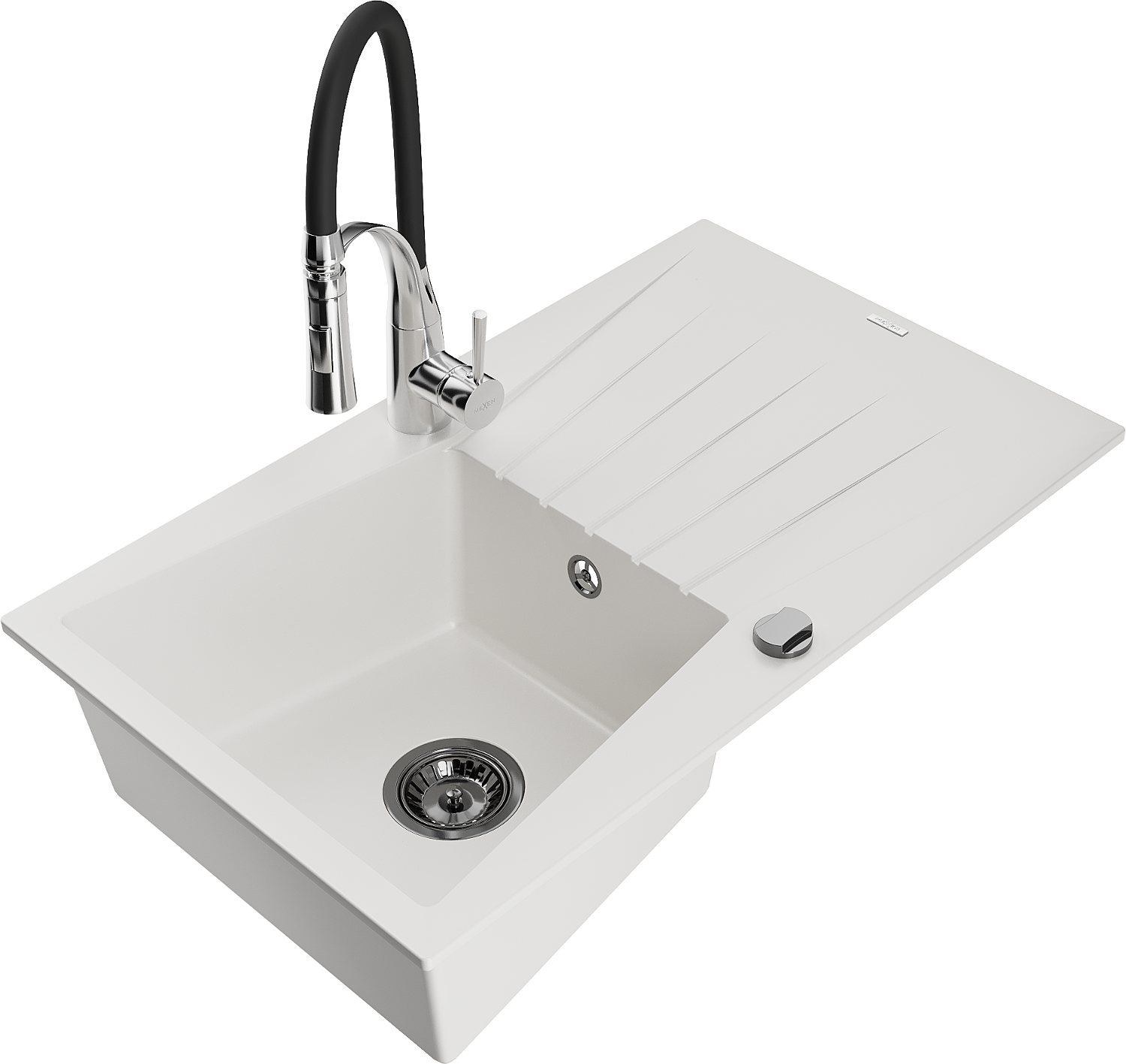 Mexen Cesar granitā izlietne ar vienu bļodu un noteces paliktni un virtuves jaucējkrānu Aster, balts - 6514-20-73450-07-B