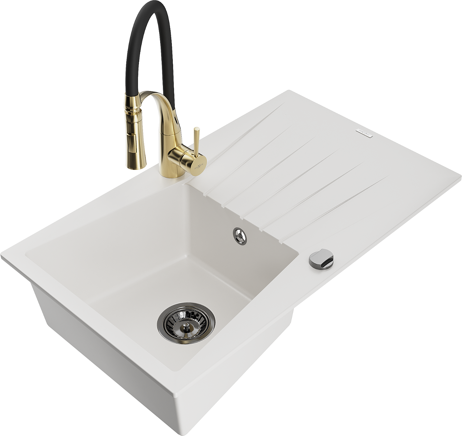 Mexen Cesar granīta izlietne ar 1 nodalījumu, žāvēšanas virsmu un virtuves jaucējkrānu Aster, balta - 6514-20-73450-57-B