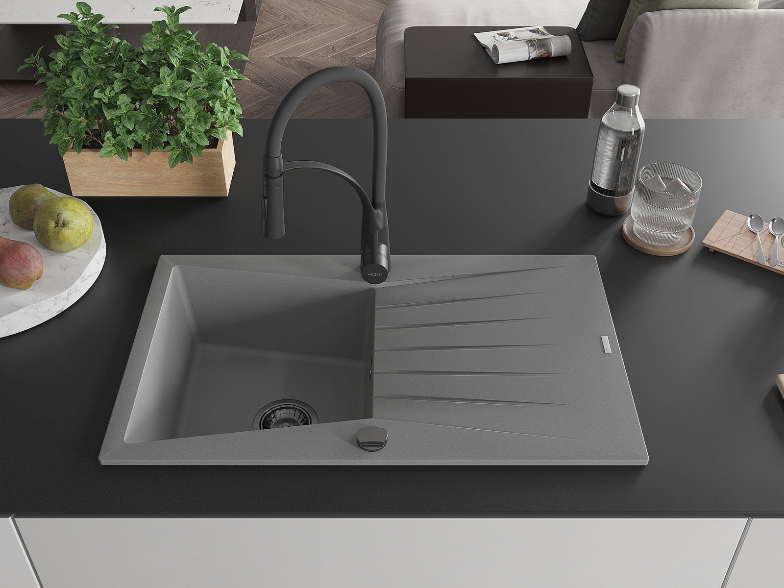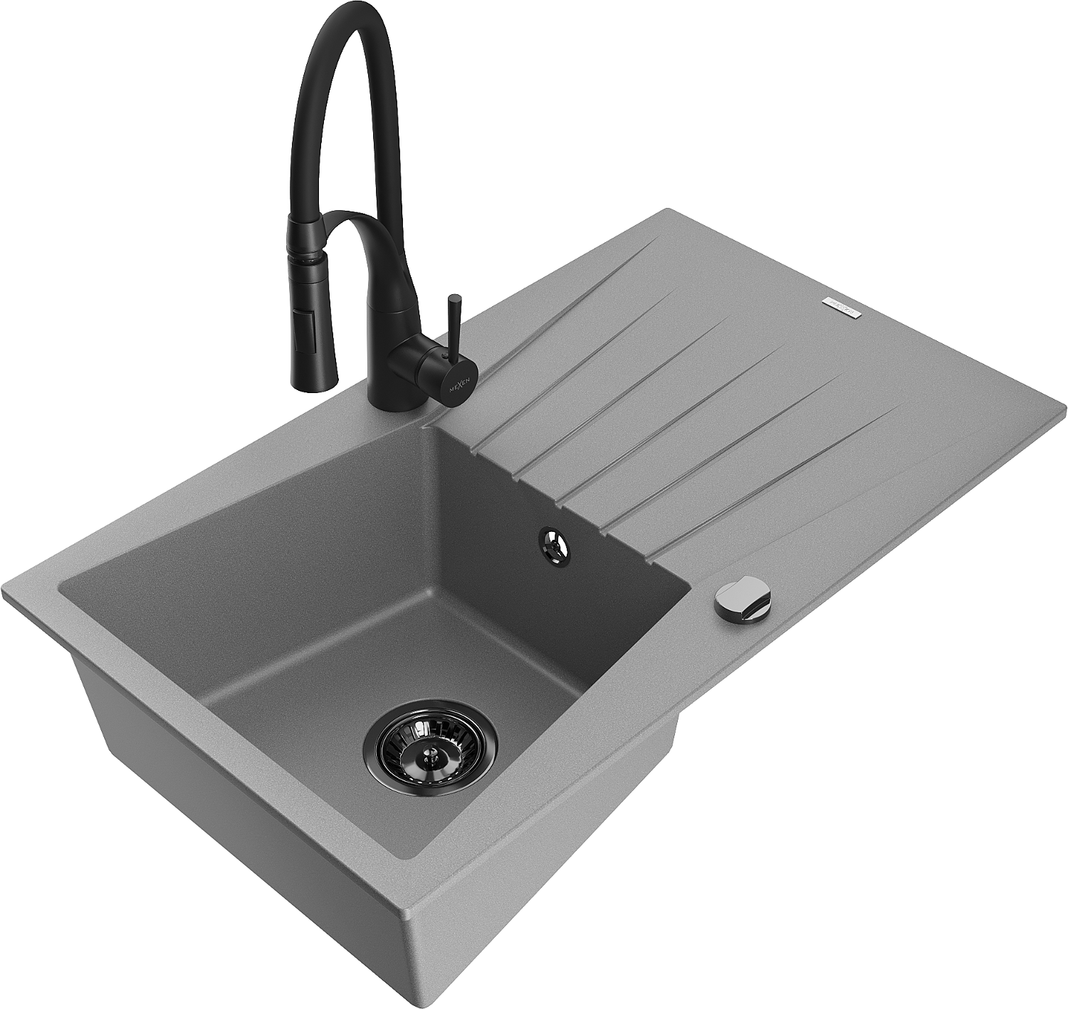 Mexen Cesar granīta izlietne ar vienu nodalījumu, drenāžu un virtuves jaucējkrānu Aster, pelēks - 6514-71-73450-70-B