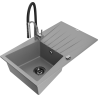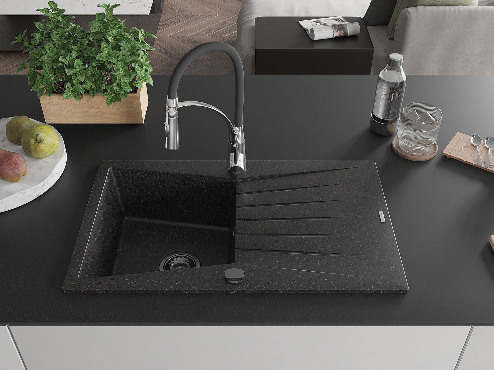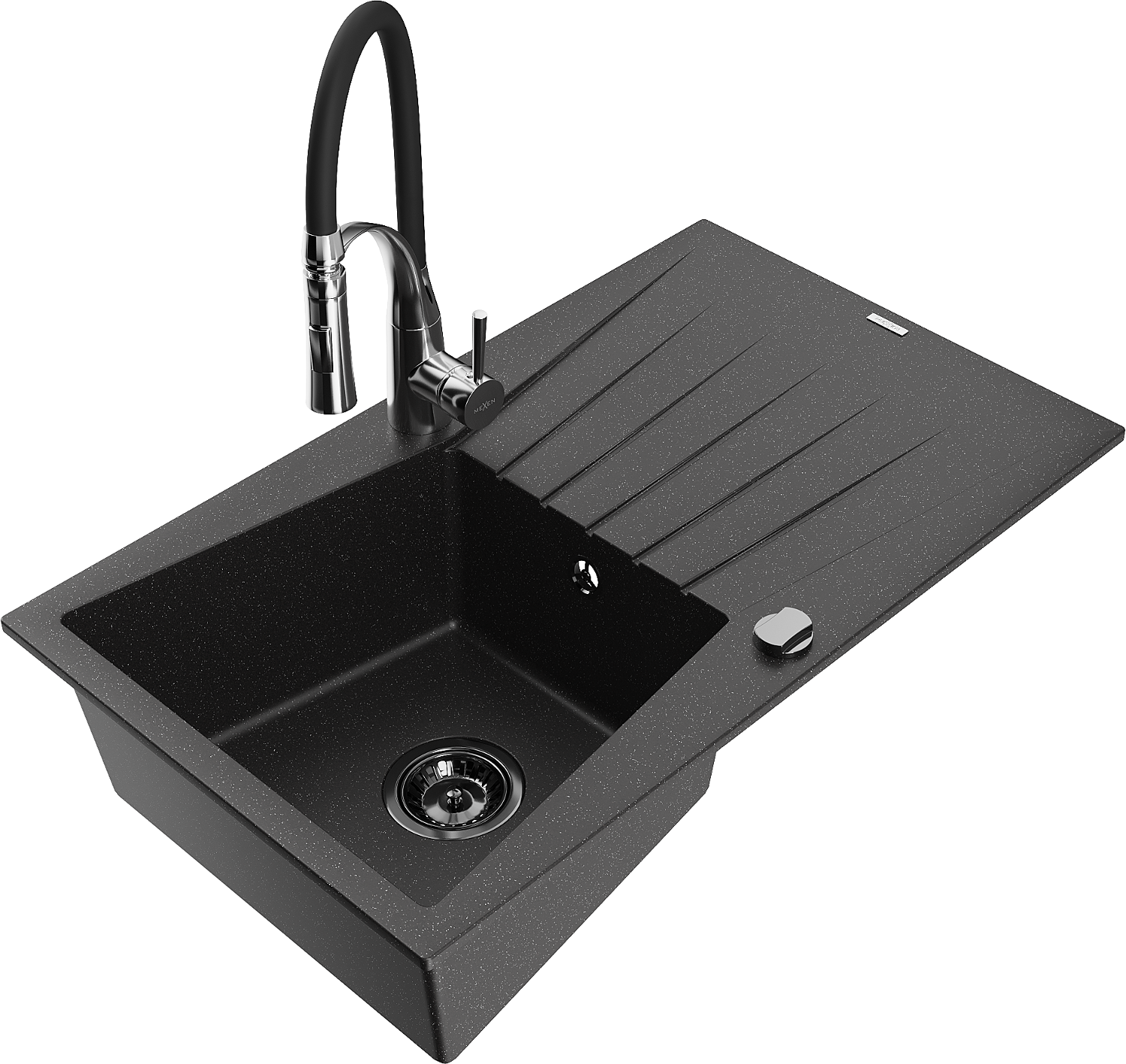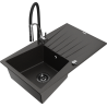 Mexen Cesar granitizlietne vienas kameras izlietne ar noteces virsmu un virtuves jaucējkrānu Aster, melns/sudraba metālisks