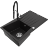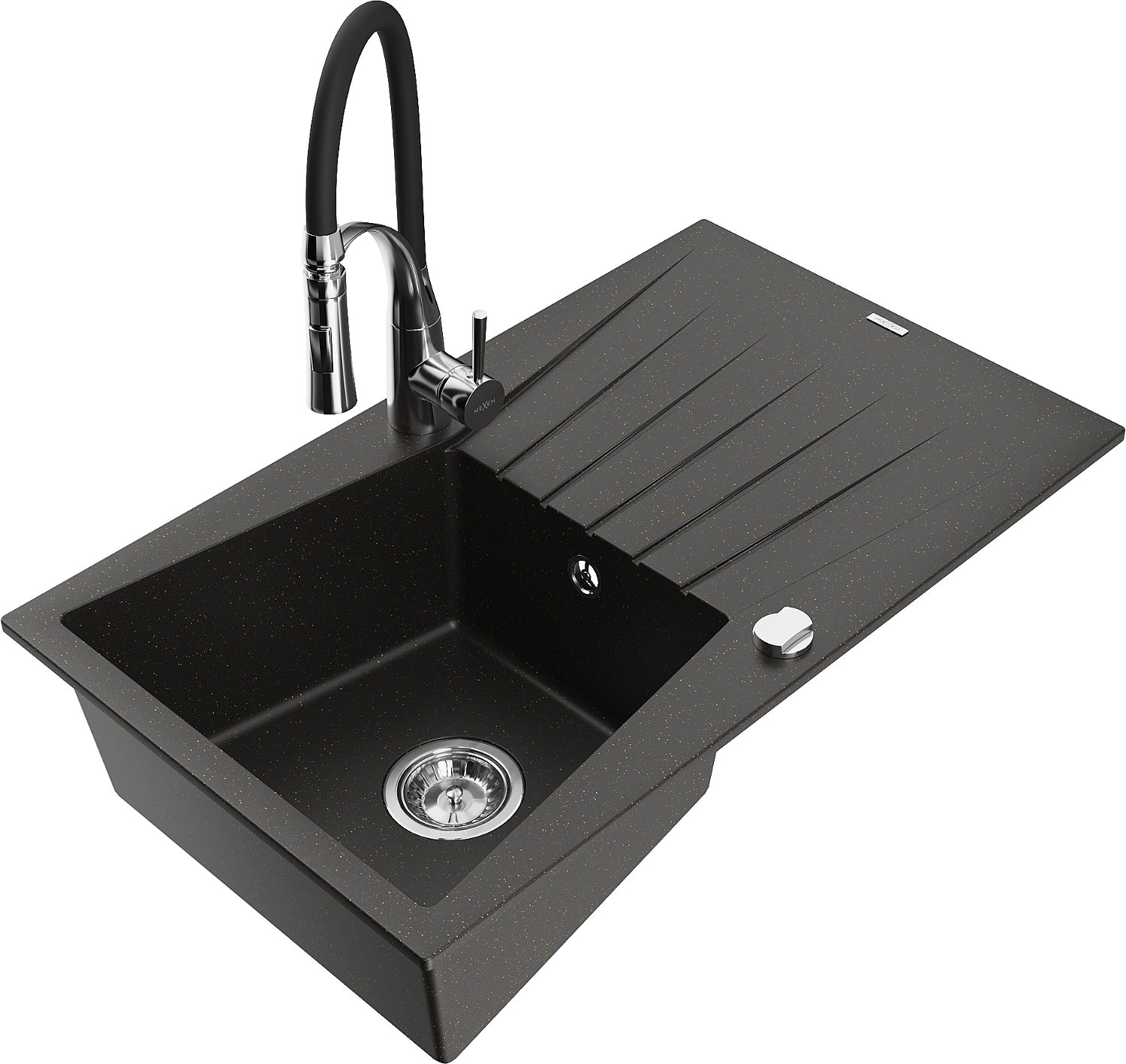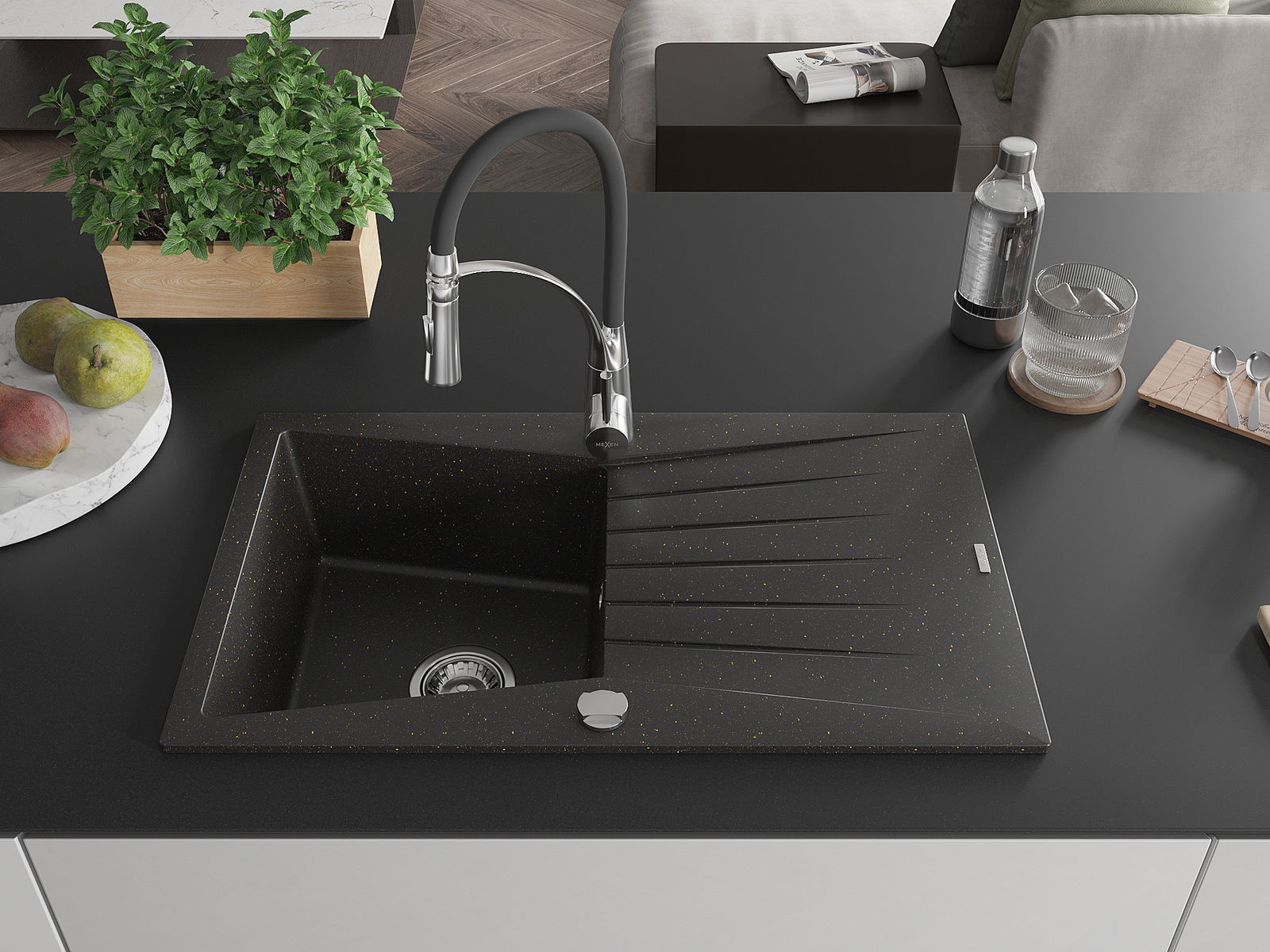 Mexen Cesar granīta izlietne ar vienu nodalījumu, ar noteces pannu un virtuves jaucējkrānu 'Aster', melna/zeltīta metālika