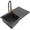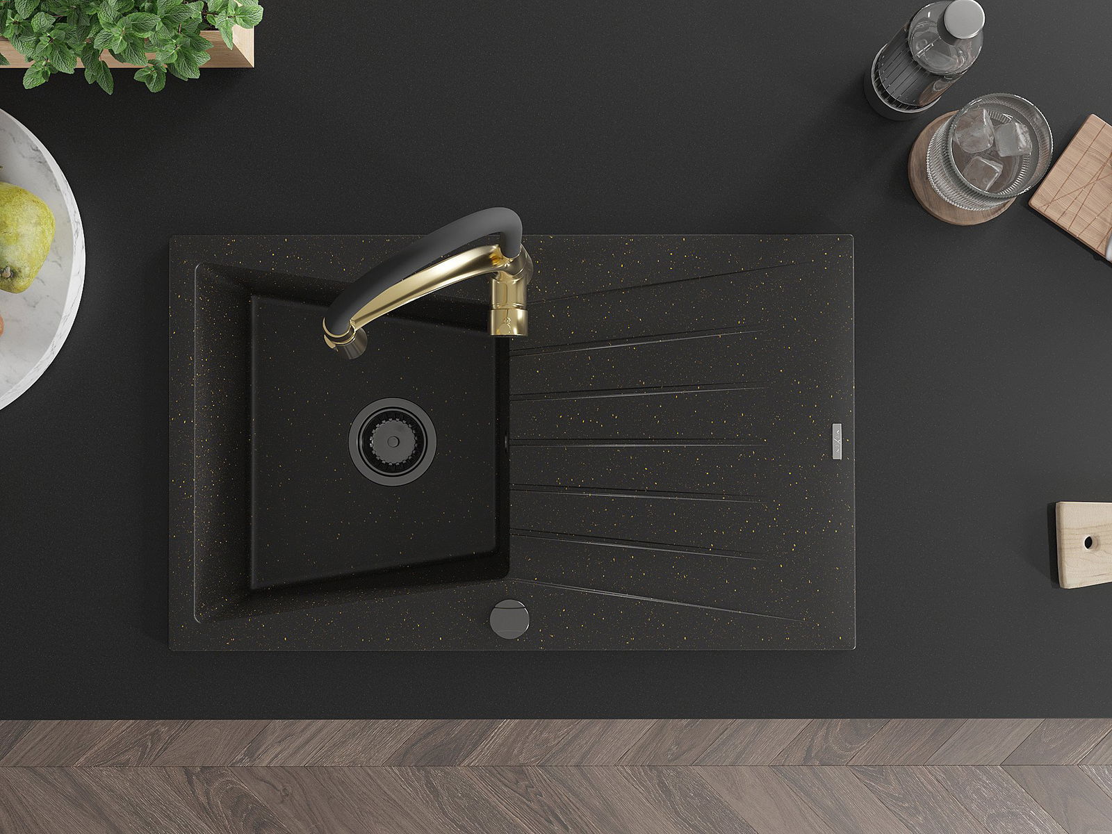 Mexen Cesar granitīgs 1-kameras izlietne ar noteci un virtuves jaucējkrānu Aster, melns/zeltains metāliks - 6514-75-73450-57-B