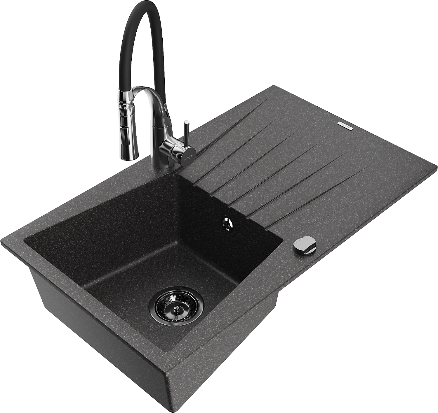Mexen Cesar Granitais vienkameras izlietne ar noteces zonu un virtuves krānu Aster, melna ar punktiem - 6514-76-73450-07-B