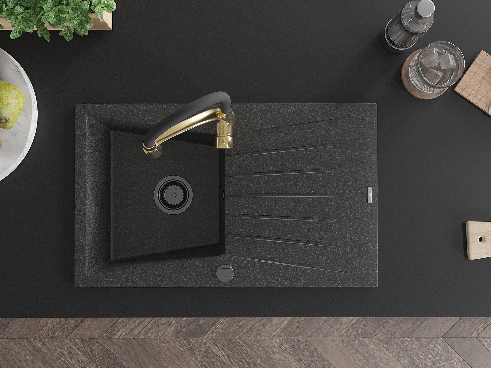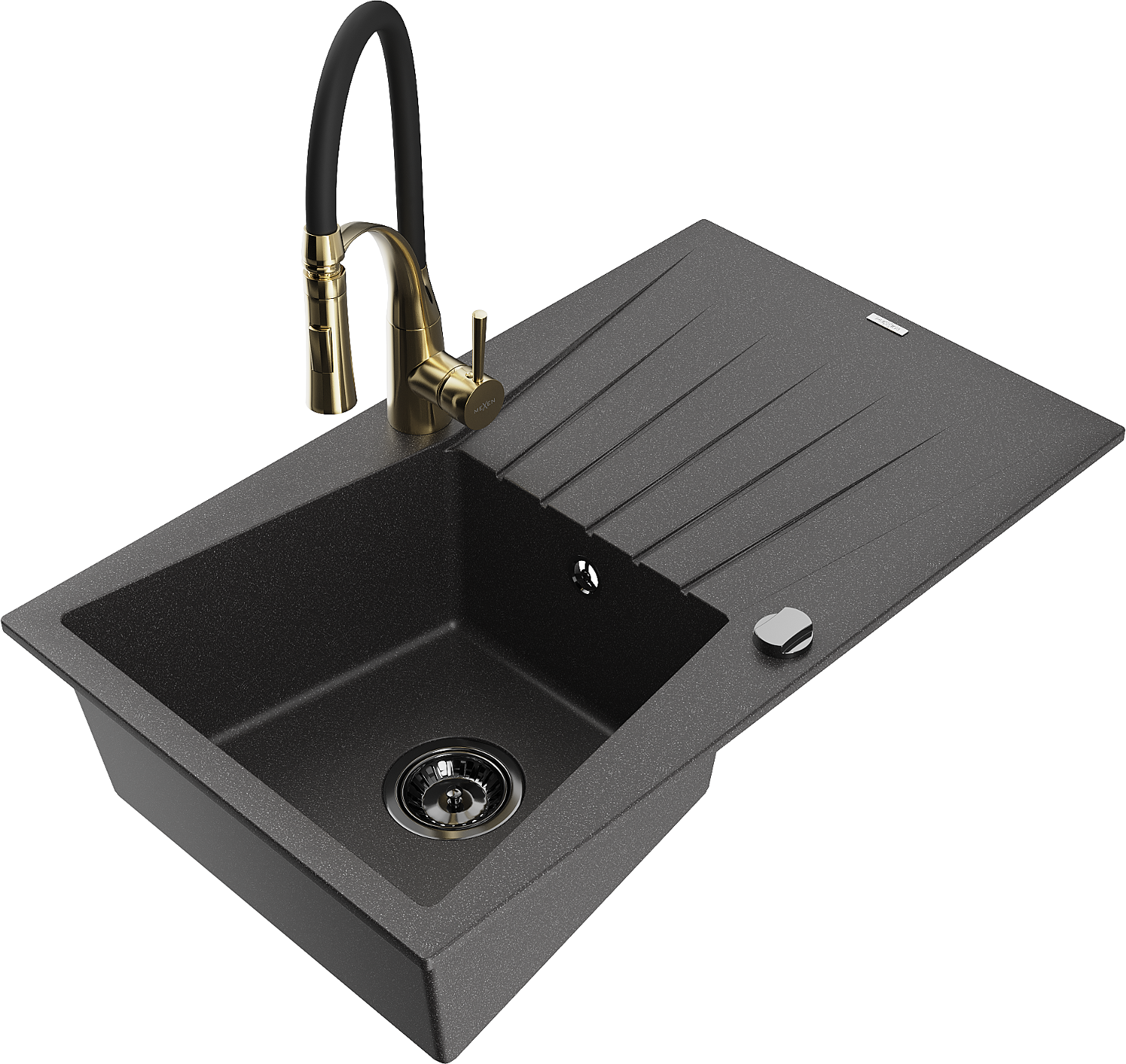Mexen Cesar 1-kameru granīta izlietne ar noteces vietu un virtuves jaucējkrānu Aster, melna ar plankumiem - 6514-76-73450-57-B