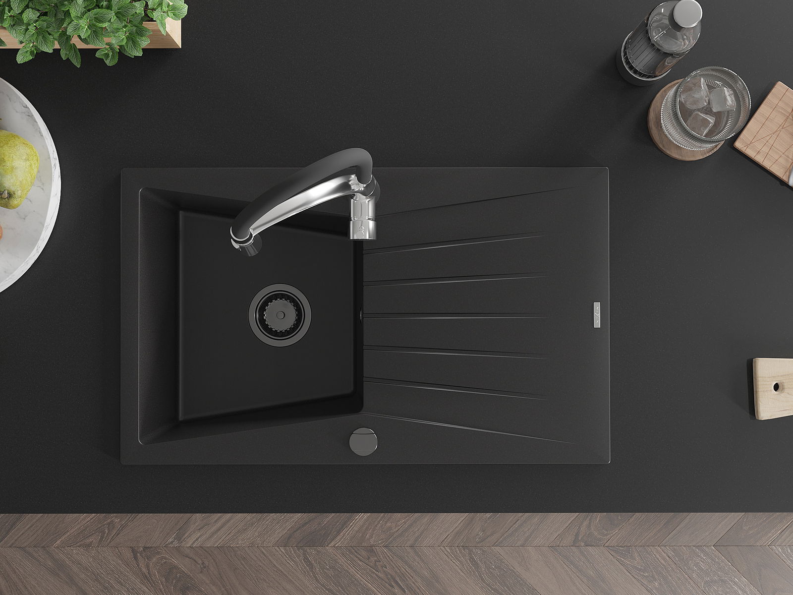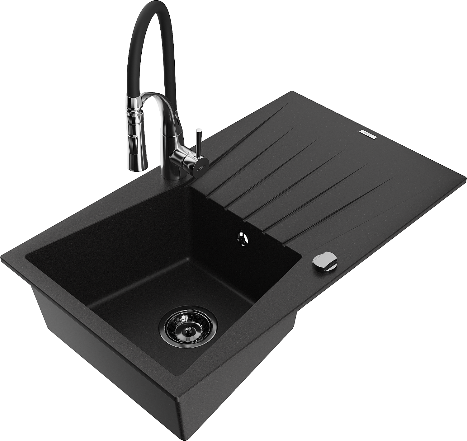 Mexen Cesar granitizlietne 1-kameru ar notecētavu un virtuves jaucējkrāns Aster, melns - 6514-77-73450-07-B
