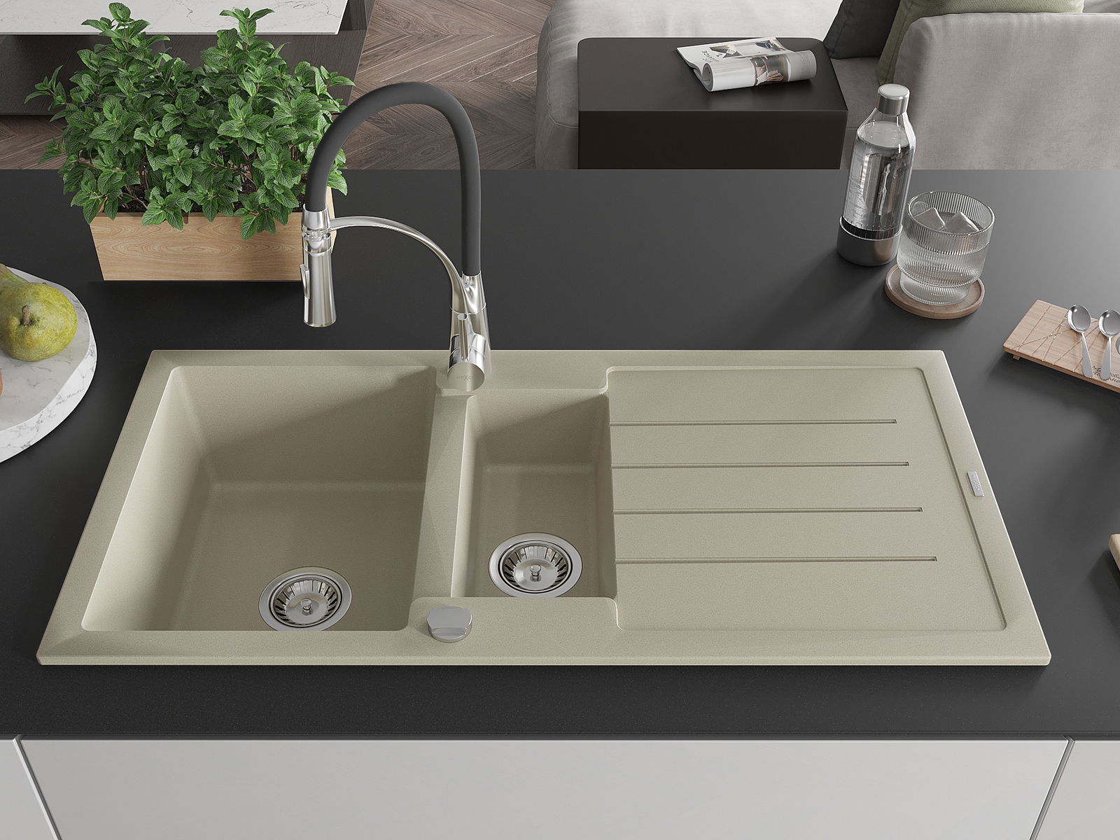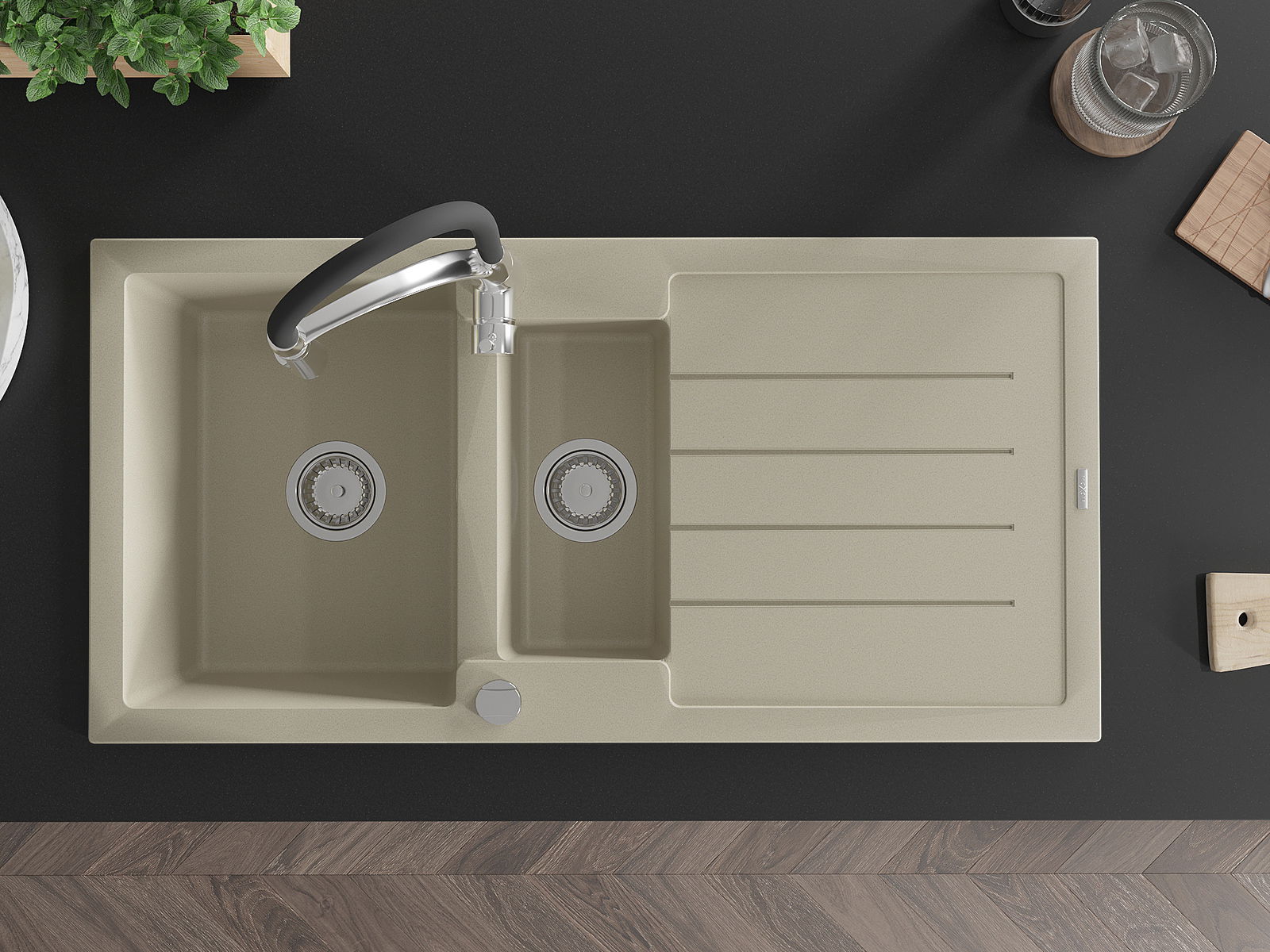 Mexen Andres granitizlietne 1,5-kameras ar nosusinātāju un virtuves krānu Aster, bēšs - 6515-69-73450-07