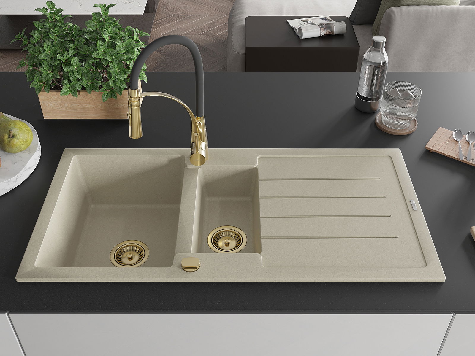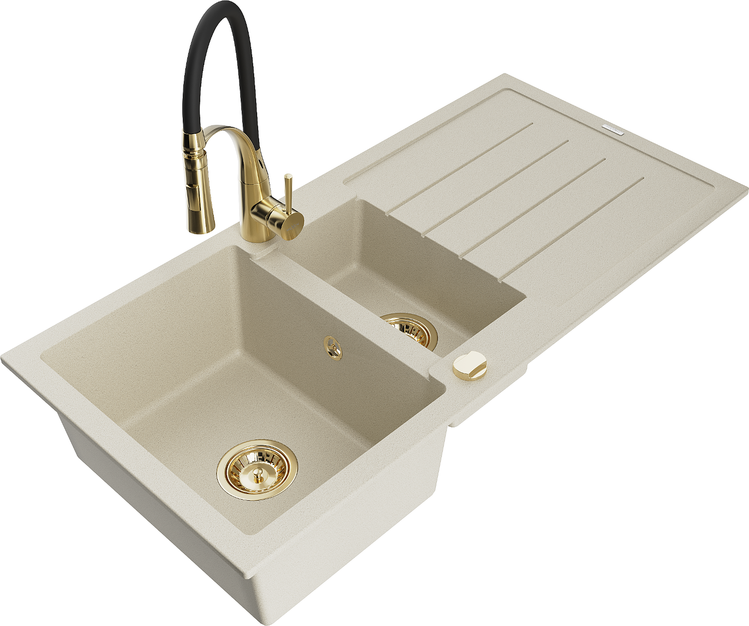 Mexen Andres granit izlietne ar 1,5 kamerām ar drenāžas un virtuves jaucējkrānu Aster, bēša - 6515-69-73450-57-G
