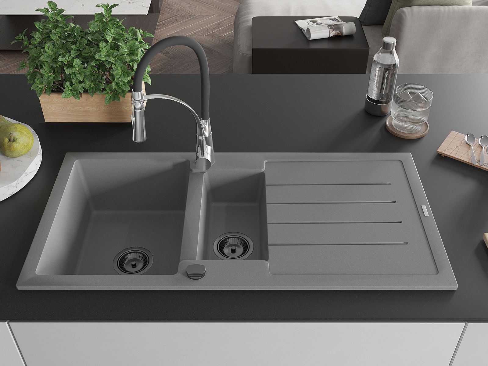 Mexen Andres granitizlietne ar 1,5 nodalījumu un iztekni, un virtuves jaucējkrānu Aster, pelēks - 6515-71-73450-07-B