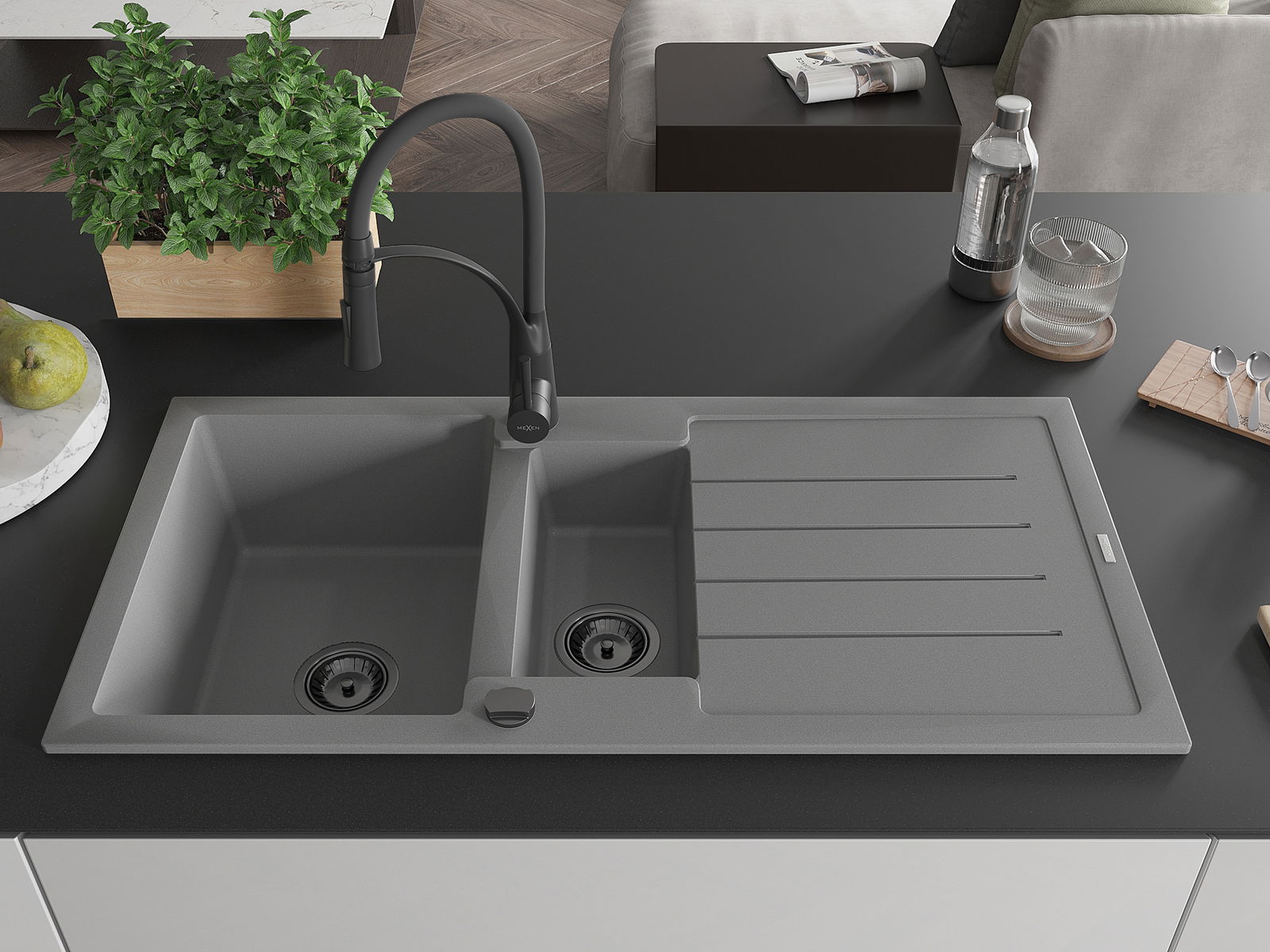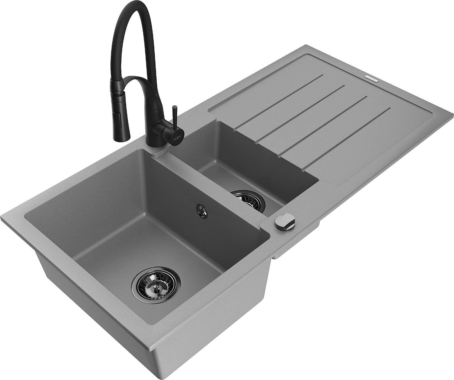 Mexen Andres granitā izlietne ar 1,5 nodalījumiem un noteces palikni, ar virtuves jaucējkrānu Aster, pelēka - 6515-71-73450-70-B