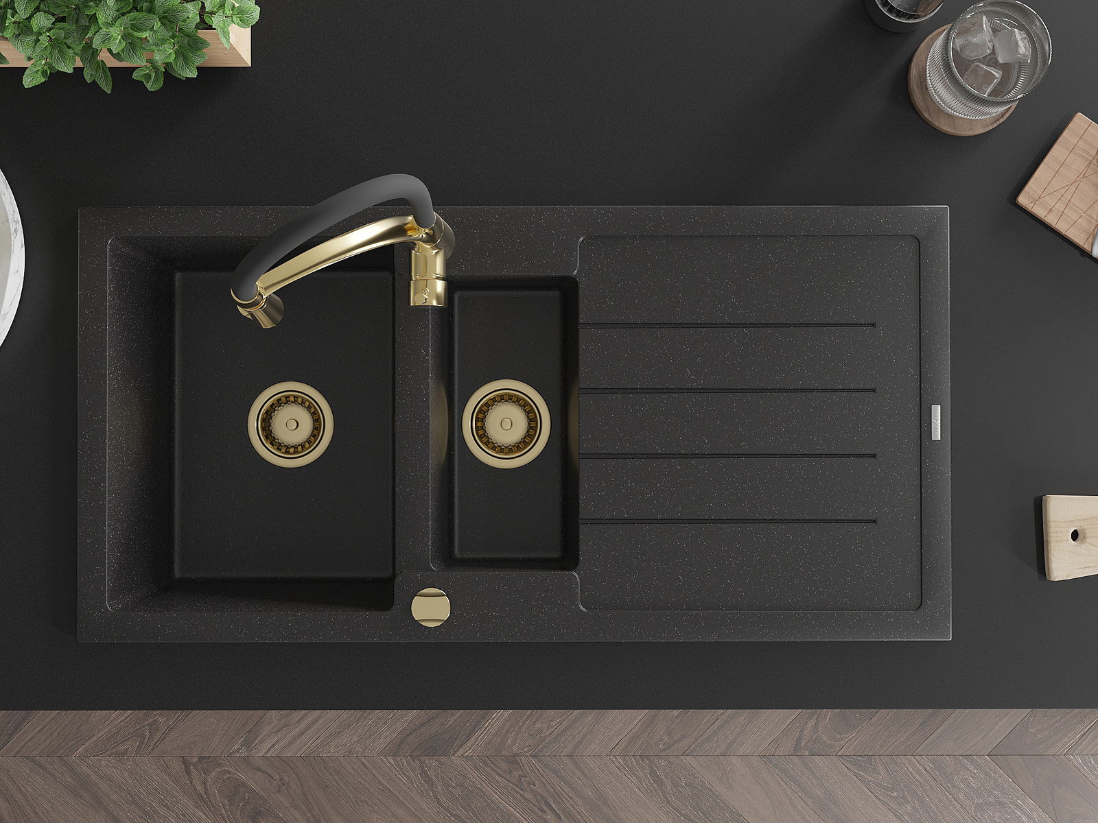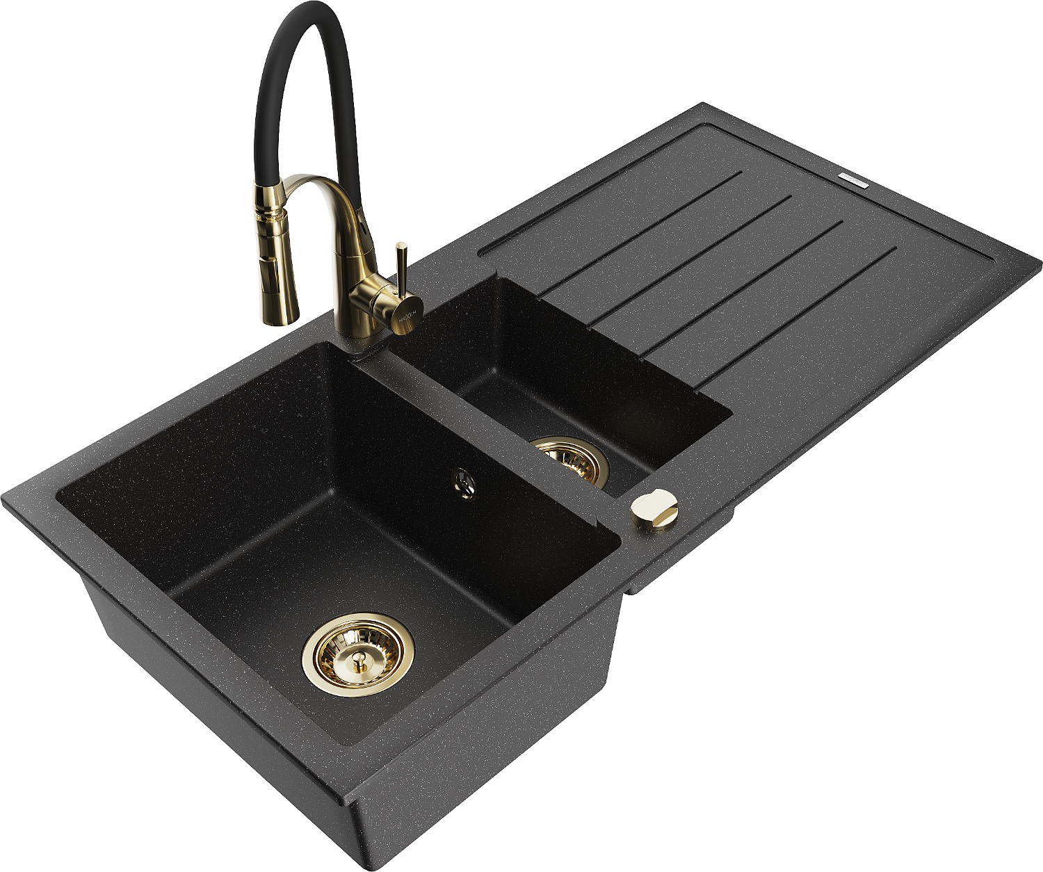 Mexen Andres granitē izlietne 1,5 nodalījuma ar notecinātāju un virtuves jaucējkrānu Aster, melna/sudraba - 6515-73-73450-57-G