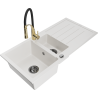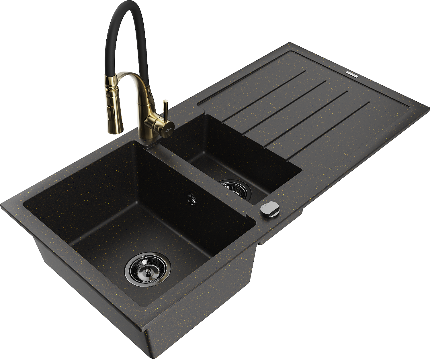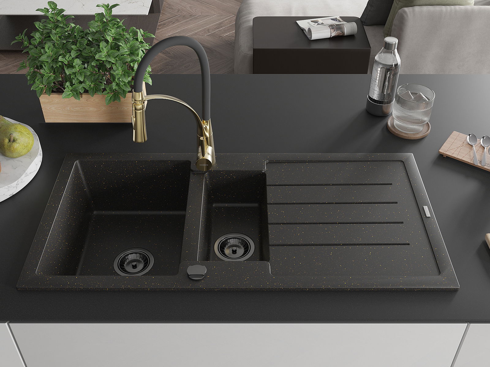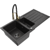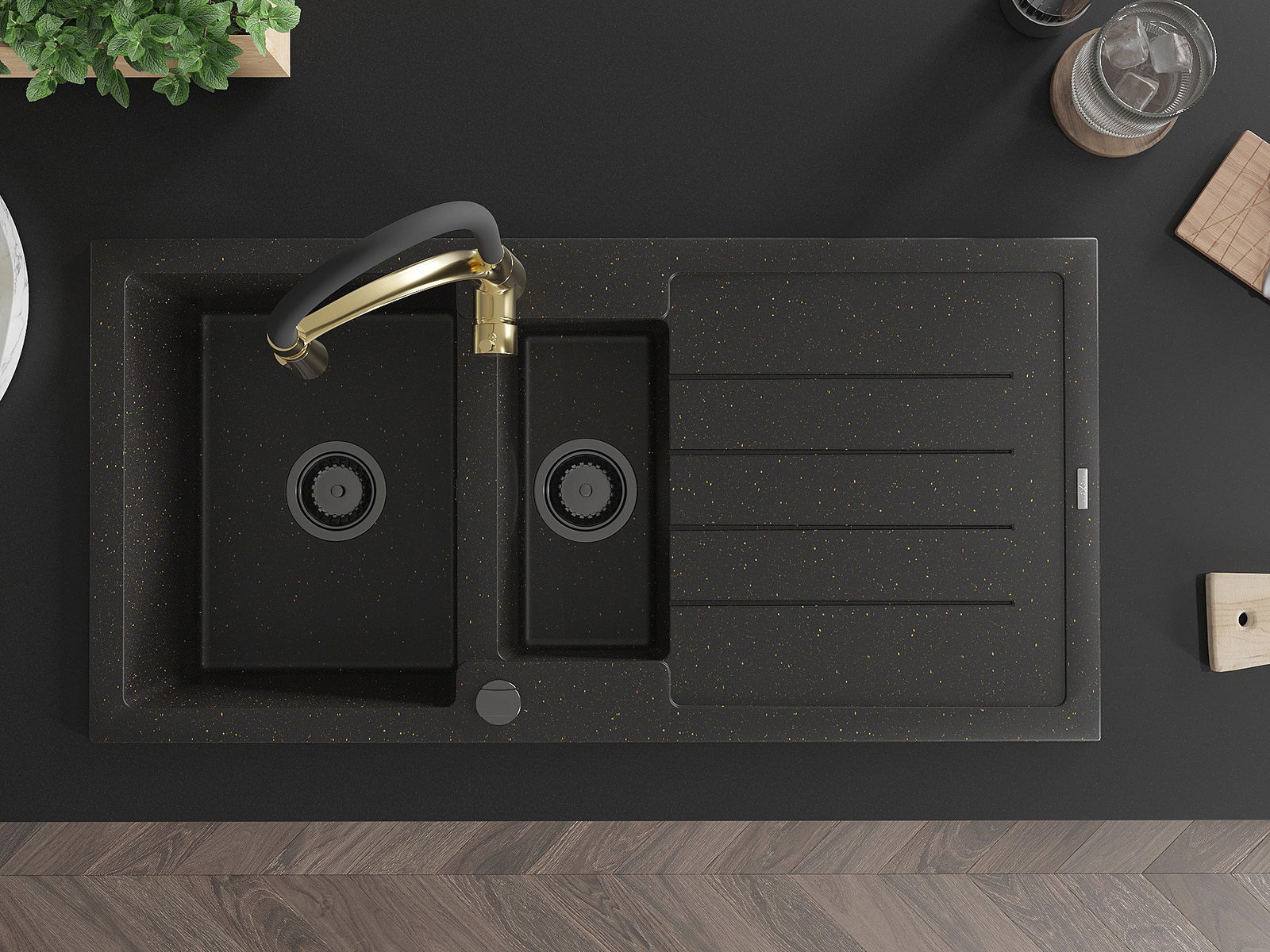 Mexen Andres granitizlietne 1,5 nodalījumu ar notecēt un virtuves jaucēkrānu Aster, melns/zeltains metālisks